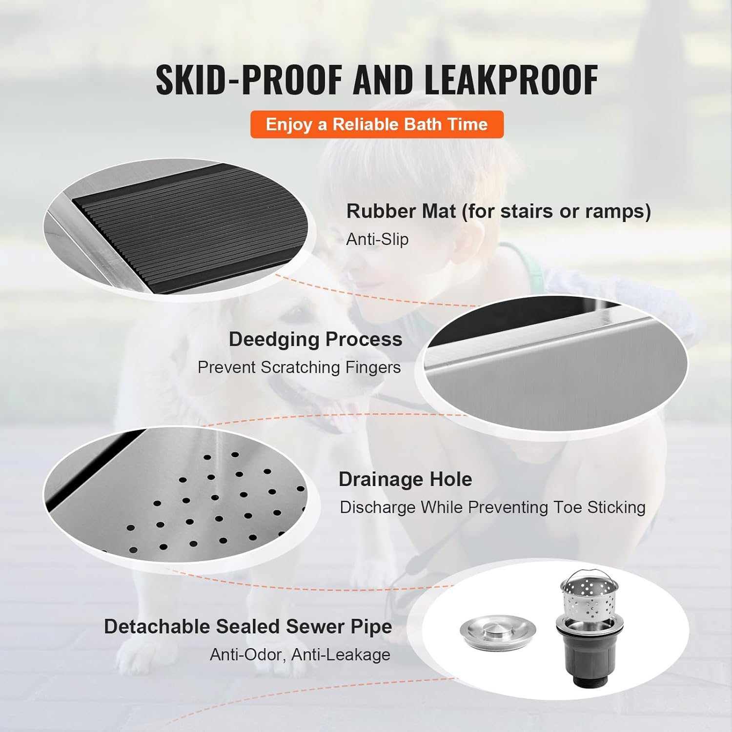 • Seamless 50" Design: Our multi-functional stainless steel pet bath tub boasts seamless welding for a leak-free experience. It's perfect for pet owners and professional groomers who want a safe and hassle-free pet care solution.