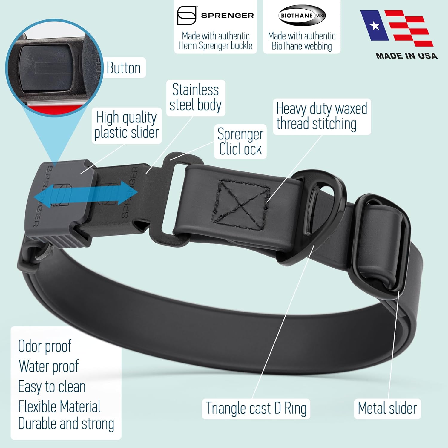 Dogline Biothane Waterproof Dog Collar with Herm Sprenger Black Stainless Steel Quick Release Buckle – Heavy Duty Tactical Durable Collar for Dogs – Comfortable and Safe Pet Collar W3/4" L12-19 Black