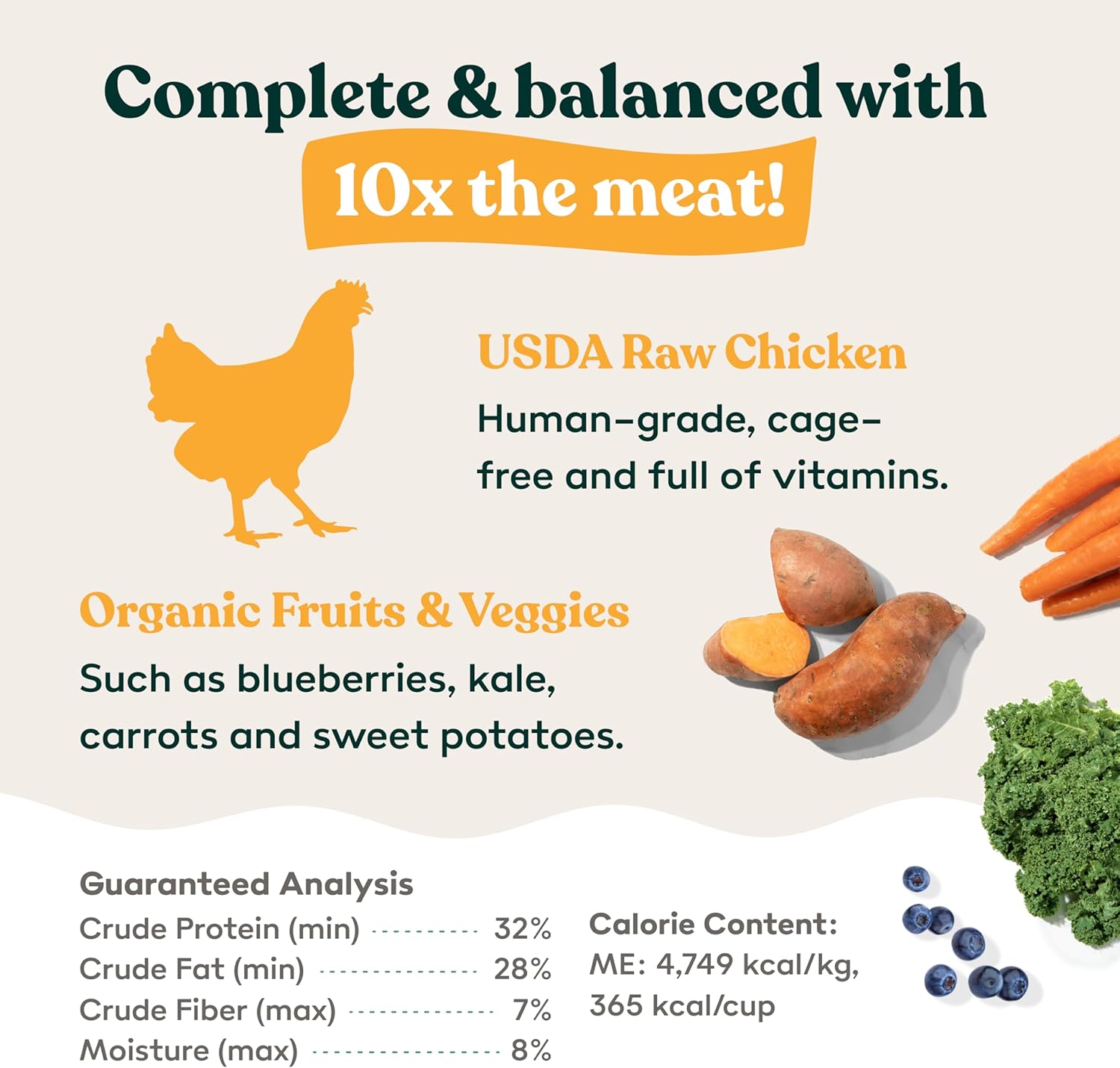 • HUMAN-GRADE: Made from just quality, cage-free, human0grade USDA-rated raw chicken, and balanced with fresh, organic fruits and veggies – that’s it! Our grain free dog food gives pups balanced, natural nutrition.