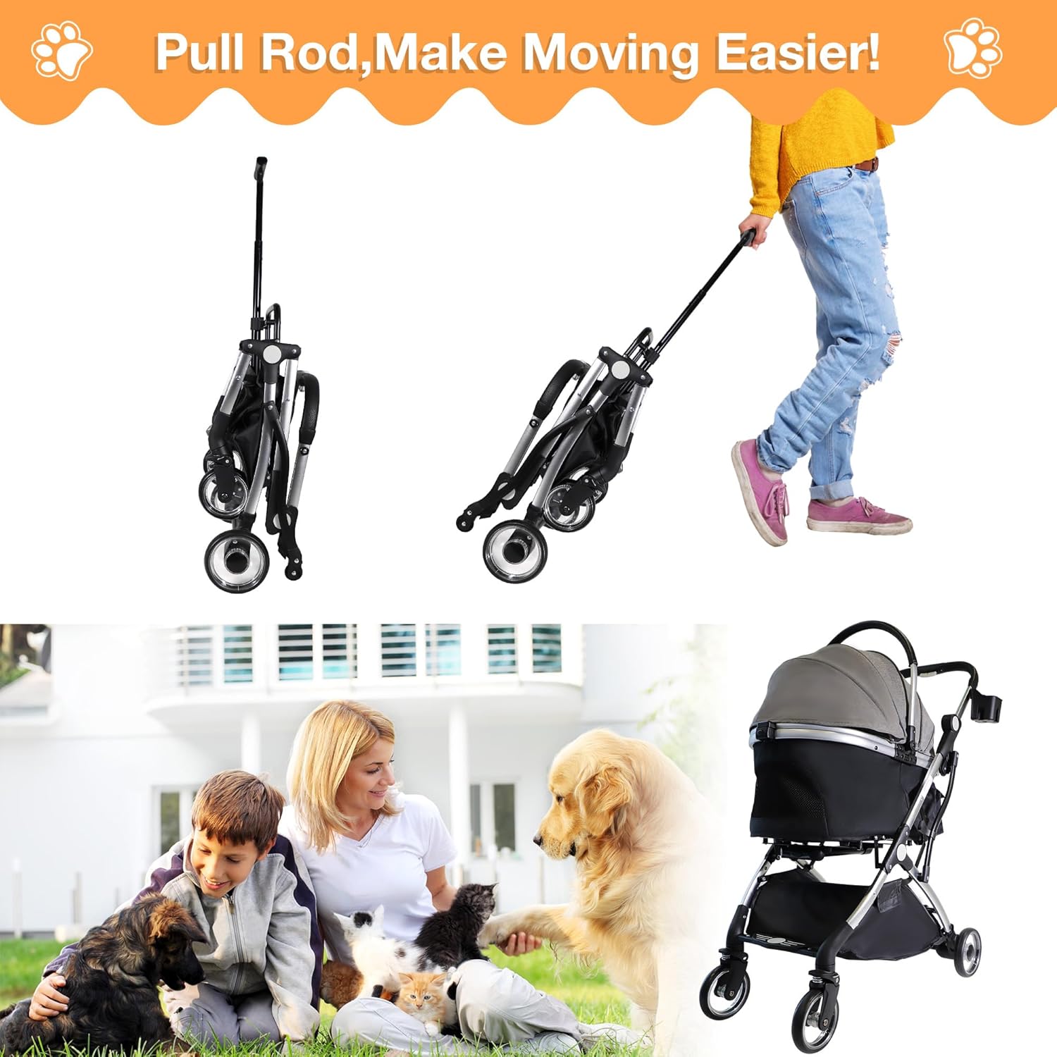 • 【Humanized Design】Our pet stroller comes with a retractable handle to for easy movement, with cup holders and large storage baskets for personal items, and a tether in the basket provides extra security for your pet. The detachable and washable pet pad also ensures maximum comfort and easy cleaning.