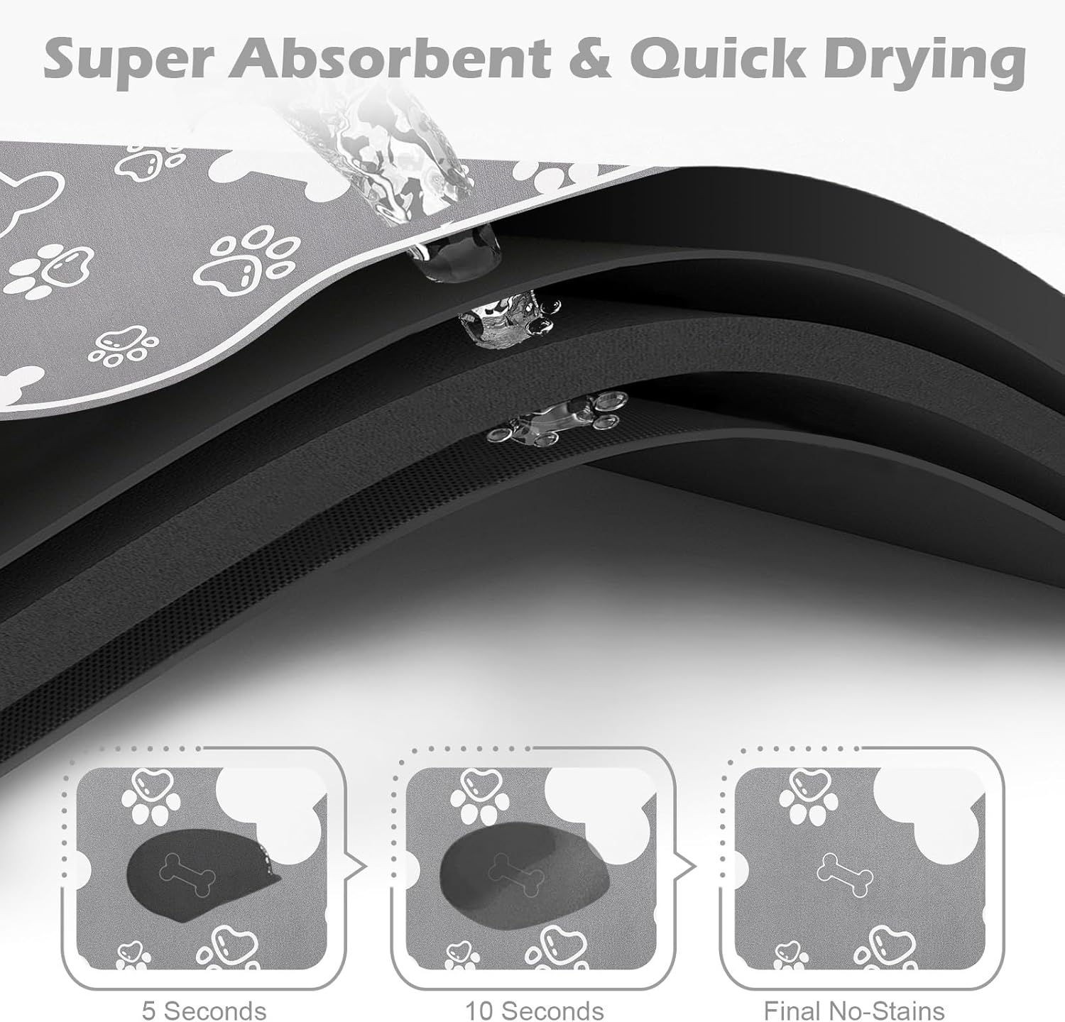 • Super Absorbent & No Stains: This pet feeding mat is extremely absorbent and dries quickly, absorbing any spilled water and milk,protecting your floors from stains and damage. Say goodbye to messy feeding areas and hello to a tidy, organized space that both you and your pets will appreciate.