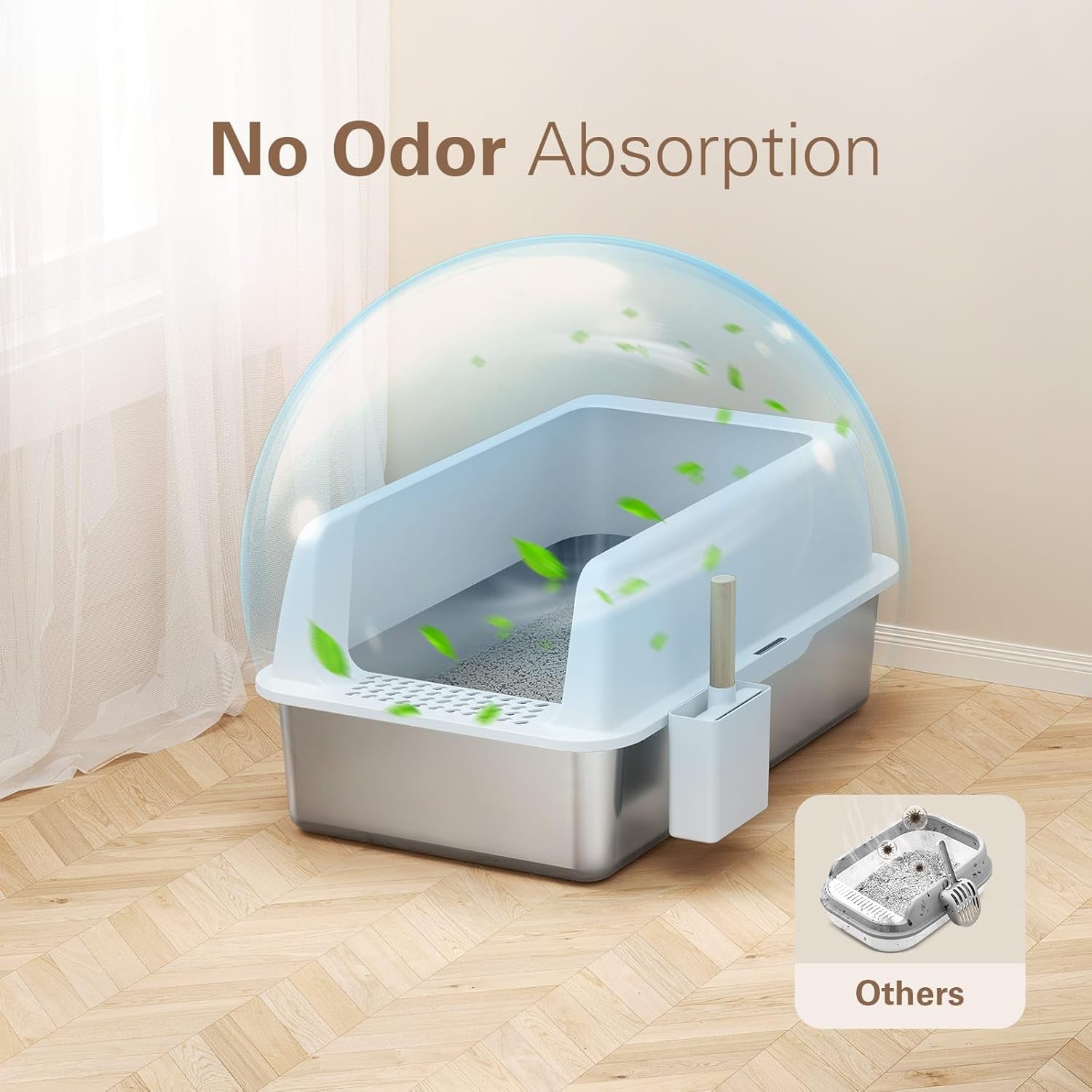• 【Sturdy Stainless Steel Build】: Constructed from thick stainless steel for added durability, the extra large stainless steel litter cat box is designed to withstand daily use, resisting rust and scratches from cat paws. Its non-porous nature also prevents odors from lingering, extending the lifespan and reducing the need for frequent replacement