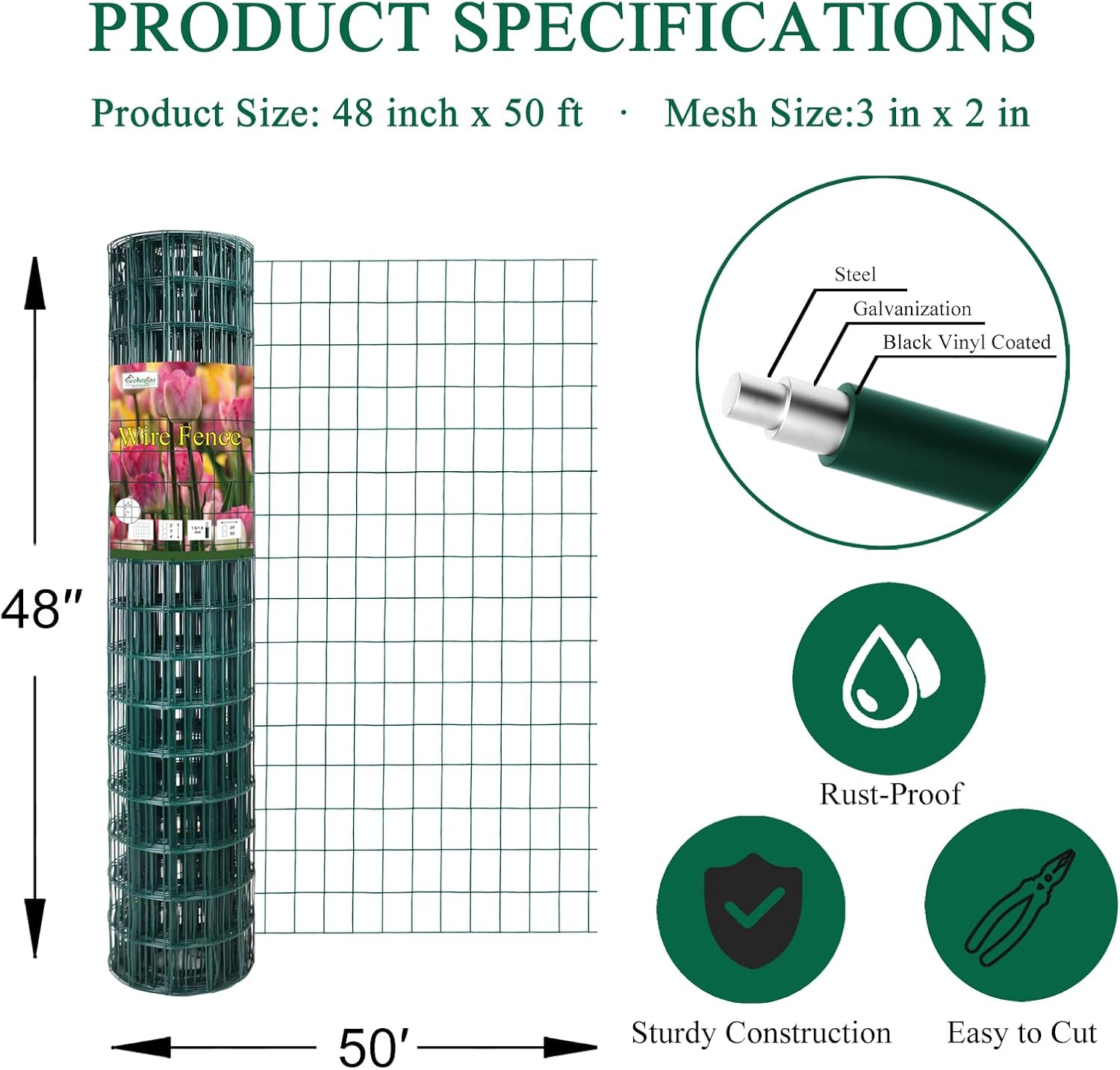 • The inner wire diameter is 16 gauge (1.5mm), after vinyl coating 1.9mm. Mesh size 2"x3". Measures 48 inches in height and 50 feet in length. Green color.
