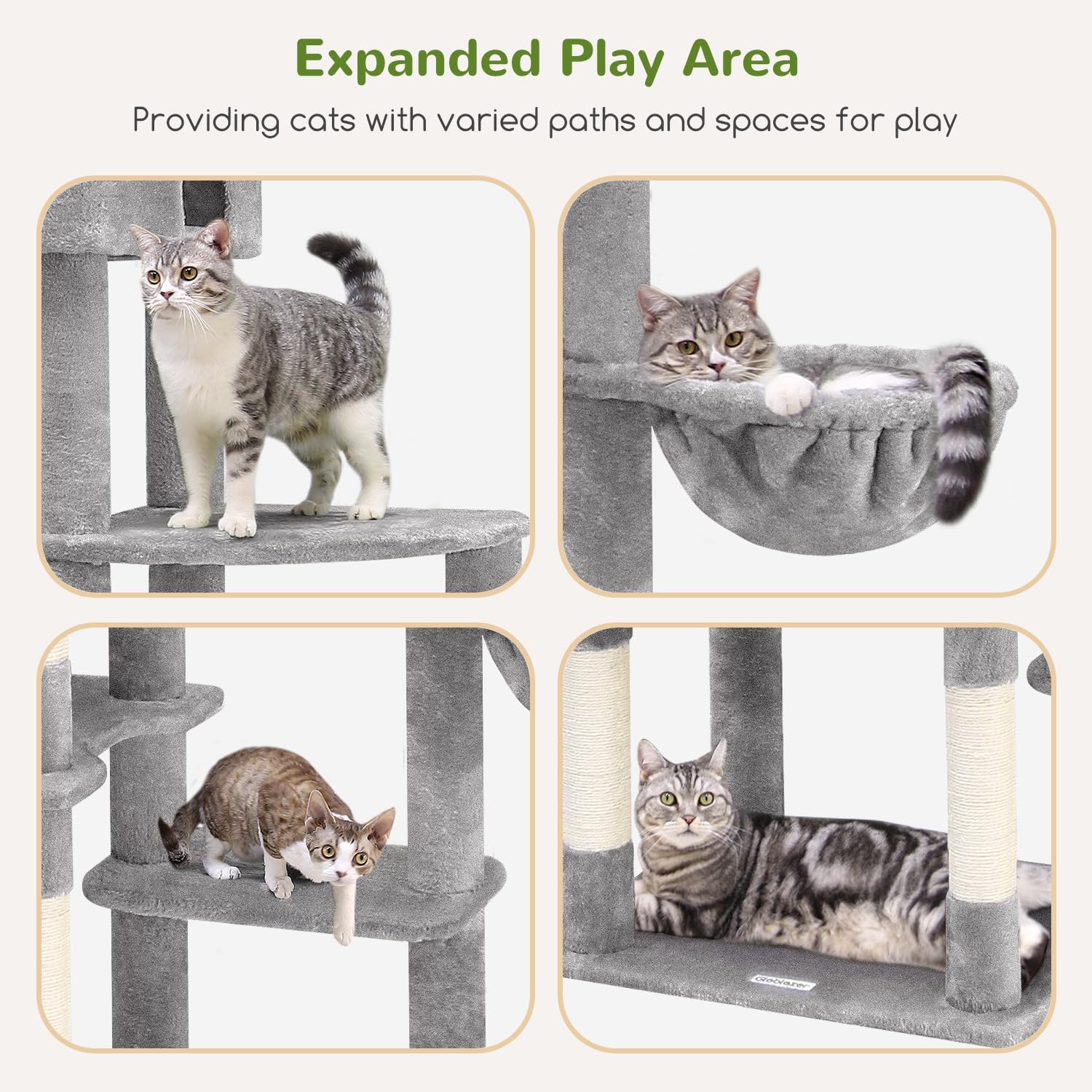 • STABLE STRUCTURE: This cat tree tower utilizing a trapezoidal design with multiple support points enhances stability, making your cats feel secure during playtime.