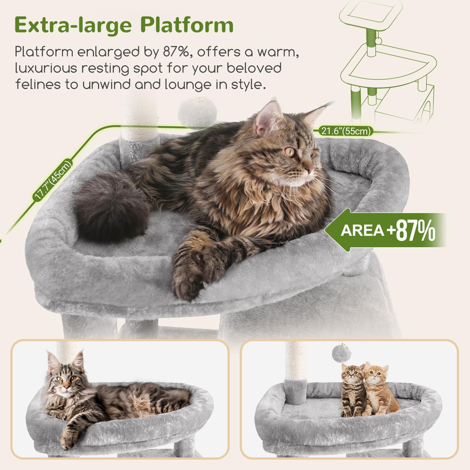 • SPACIOUS CAT CONDOS: This cat tower for indoor cats with two spacious enlarged cat condos provides privacy for big cats, suitable for multiple large felines to rest or play.