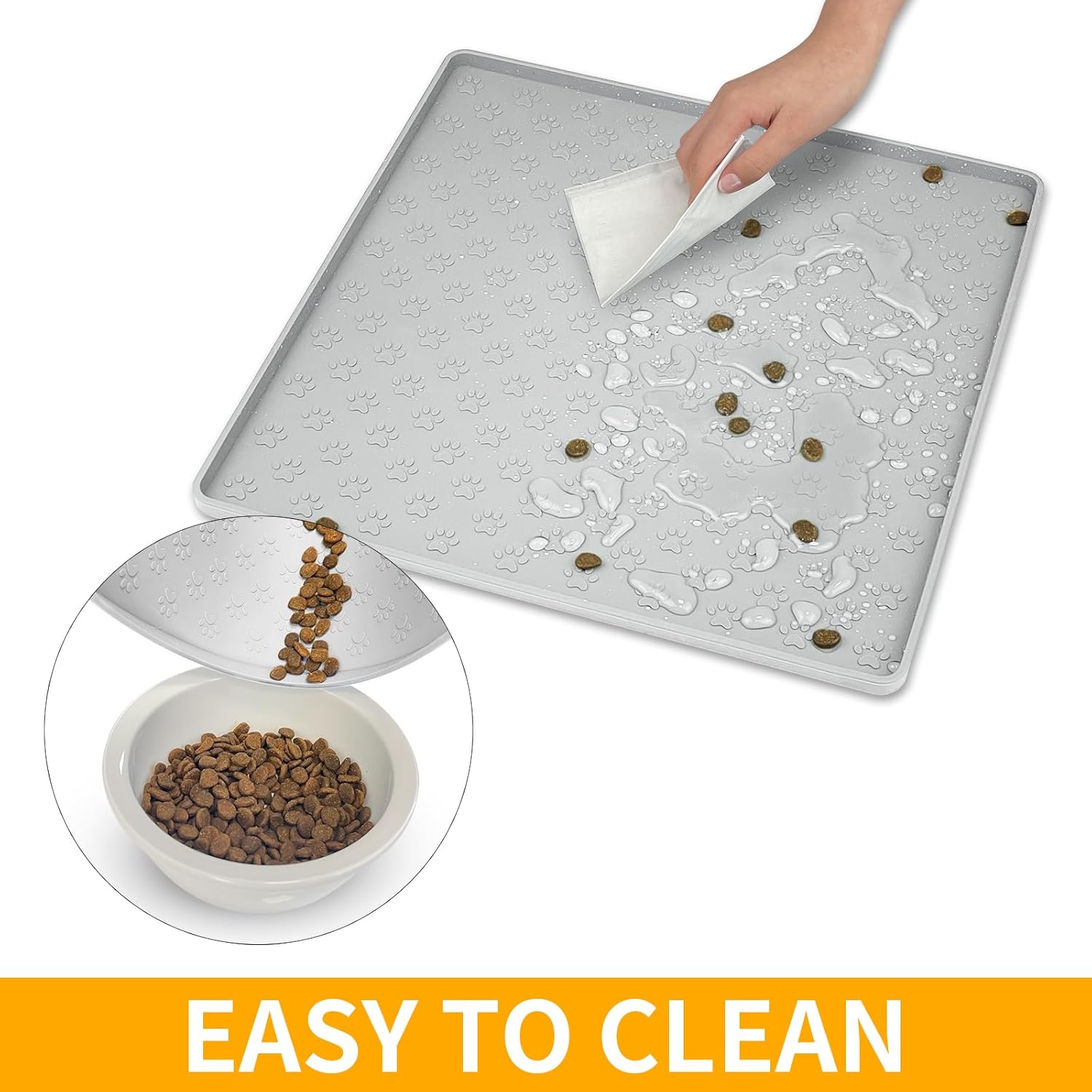 • Easy to Clean & Storage: This pet food mat can be wiped with a cloth or rinsed with water. Dishwasher safe. Soft dog feeder mat is easy to roll up for storage or take outdoors.