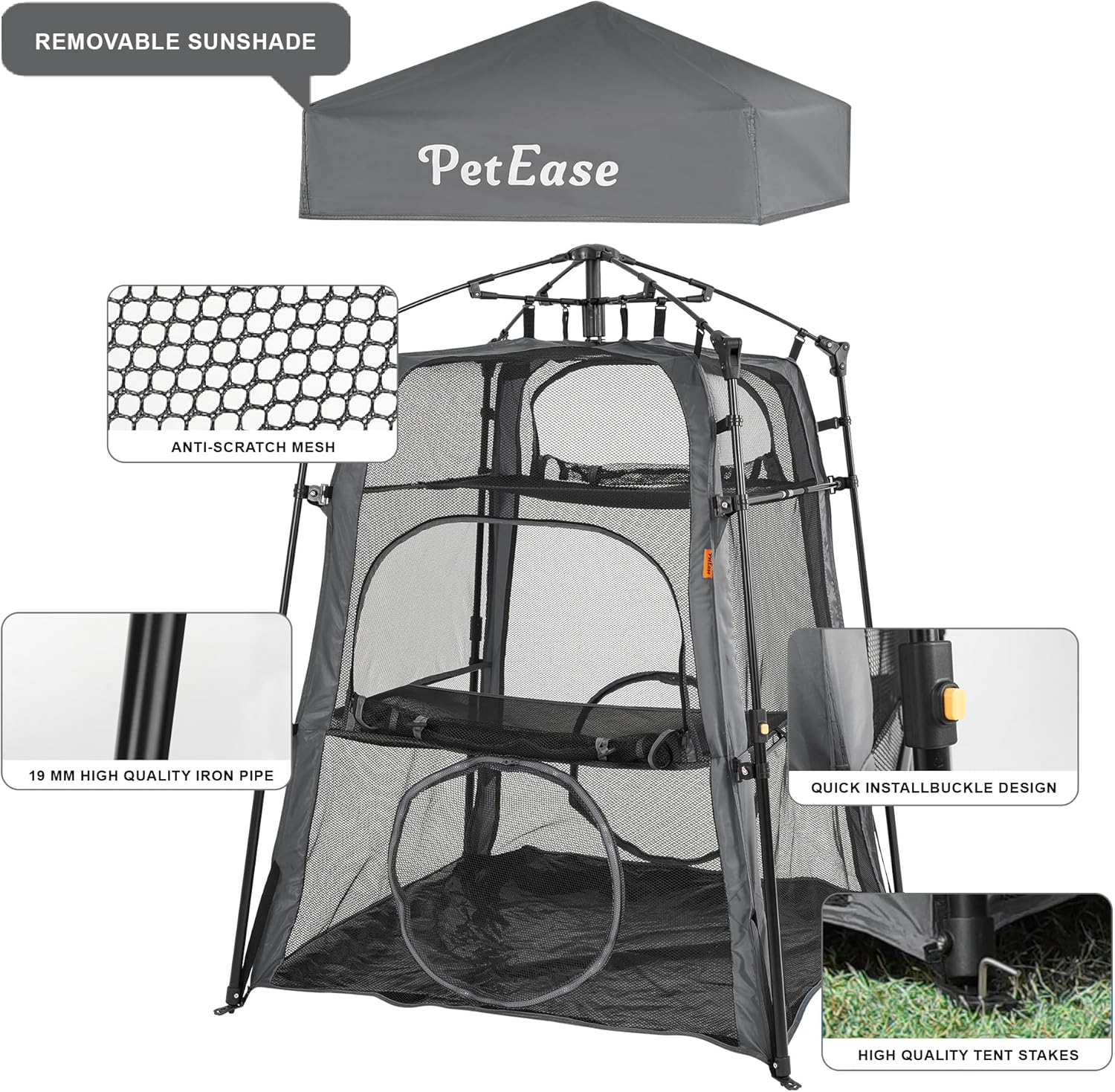 • OUTDOOR AND INDOOR USE:With breathable mesh,360-degree view,keeps your cat or small pet closer to nature.Your cat can safely enjoy the sun, green grass,fresh air and away from bugs and predators.Indoors the tent is ideal for kittens, isolating an injured pet, or introducing a new pet.The top cover can shade the sun!