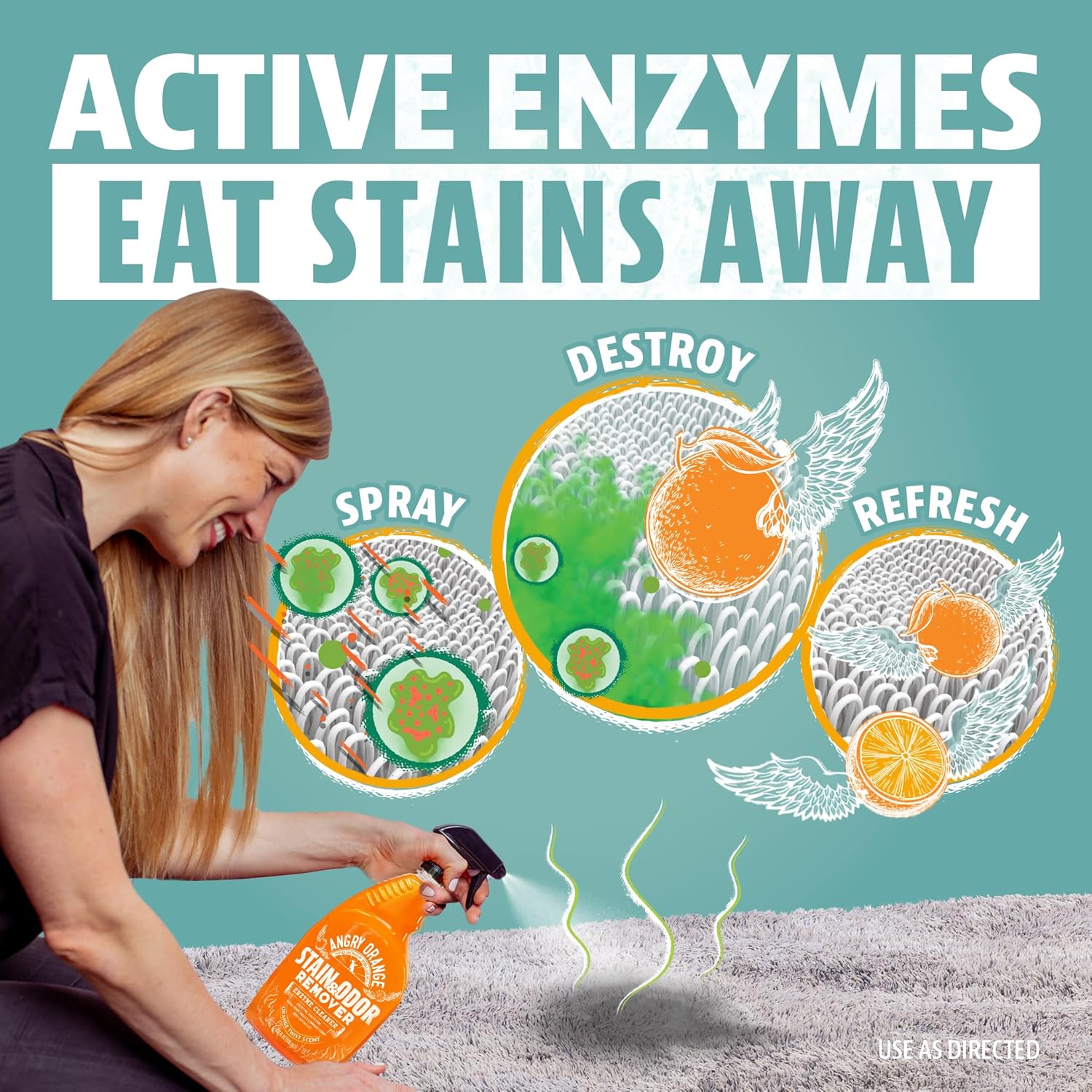 • POWERFUL STAIN FIGHTING - Angry Orange enzyme-active cleaner breaks down and eliminates stains from pet urine, feces and vomit.
