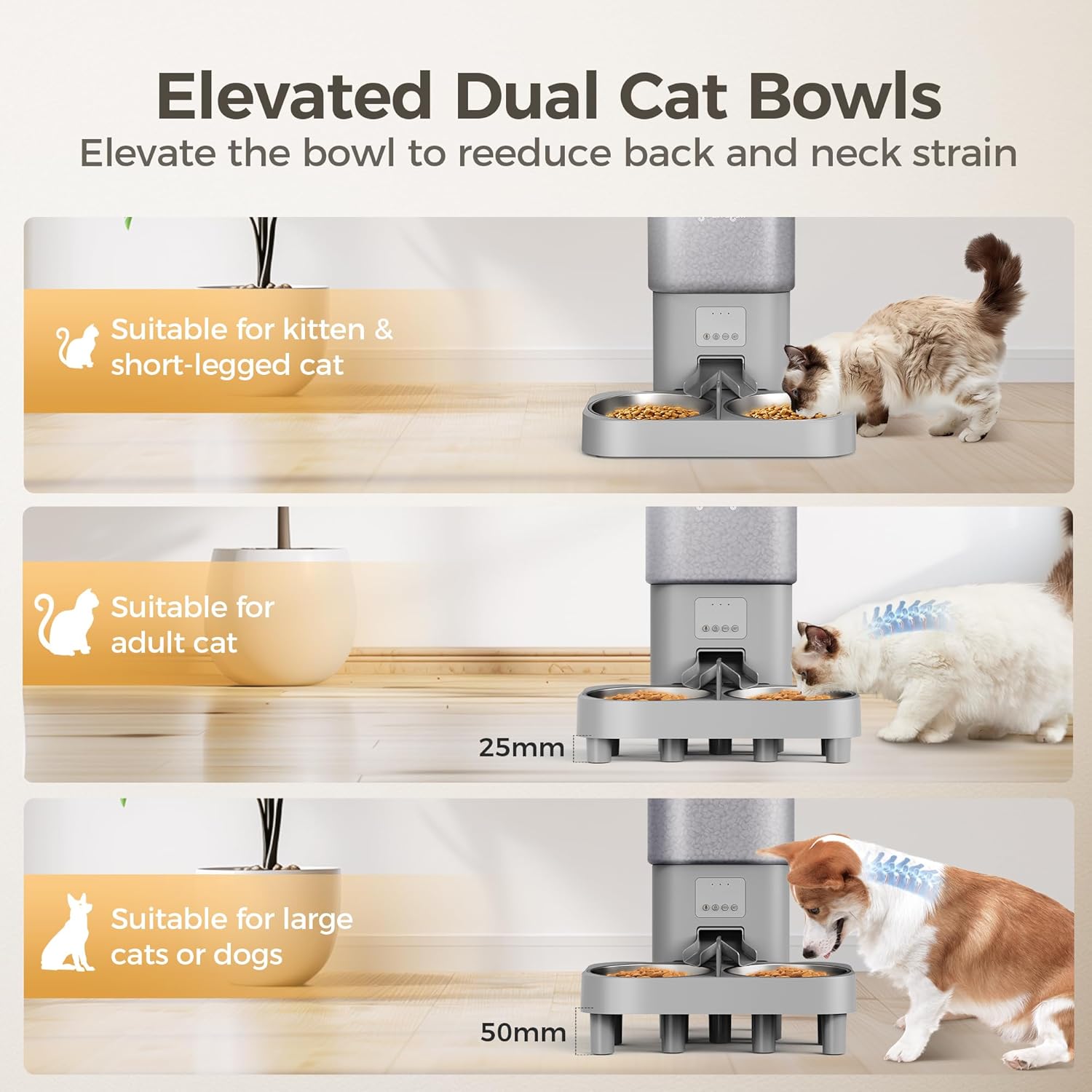 Automatic Cat Feeder, WiFi Dog Food Dispenser with APP Control for 2 Cats & Dogs, 6L Elevated Timed Dog Feeder Programmable 1-10 Meals,10s Meal Call,Dual Power Supply, 2 Stainless Bowls