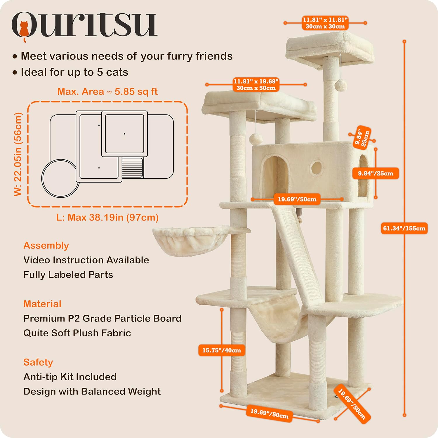 Ouritsu Cat Tree, 61 inch Tall Cat Tower for Large Cat Indoor, Enlarged Condo, 2 Padded Perches with 1 Widened, Large Hammock, Scratching Post and ramp, Fluffy Basket, Beige, LF002WH