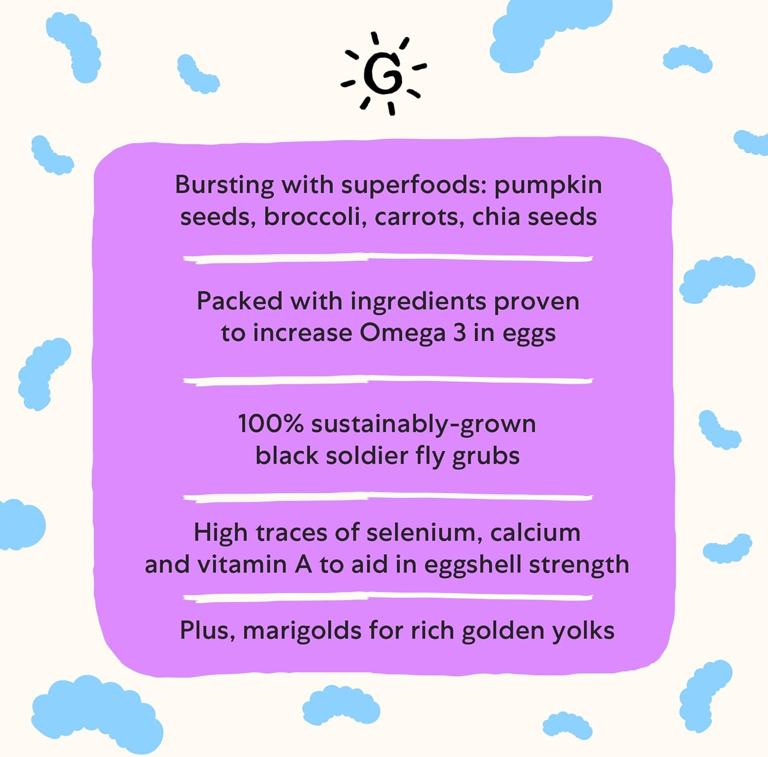 • Omega-Rich Chicken Feed Supplement: Enrich your flock’s daily diet with Grubbly Farms Omega Mix, a nutritious chicken food bursting with essential superfoods and minerals to help increase the omega-3 content in eggs. It combines the goodness of black soldier fly grubs, chia, flaxseeds, marigolds, broccoli, carrots, sunflower, and pumpkin seeds in one tasty treat.