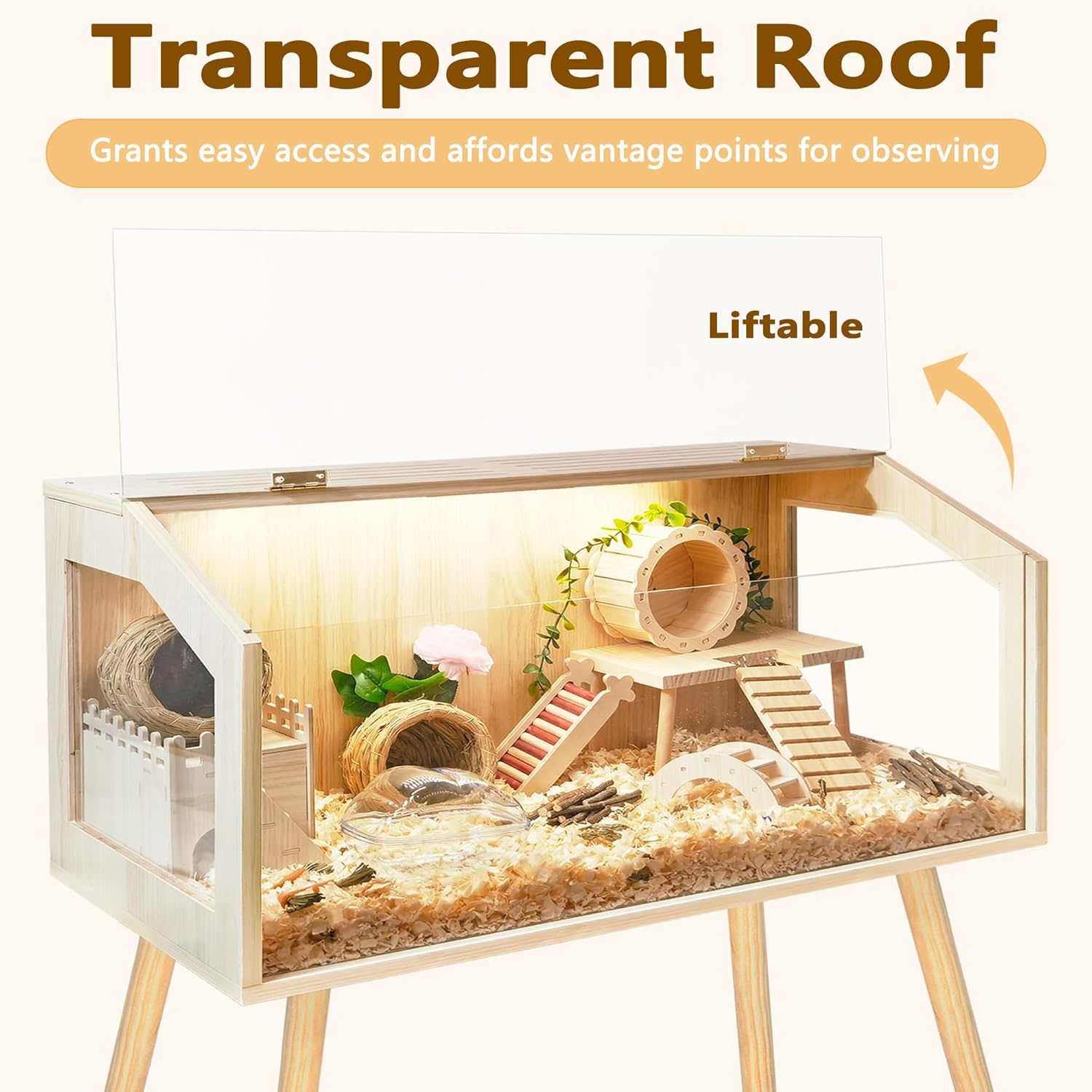 • 【High-Quality Materials】Available in 4 sizes ranging from 24 to 48 inches in length, with 24 inches legs height, please refer to picture 3 for size information. Crafted from durable, high-density natural wood treated with a rot-resistant, waterproof coating, our cage ensures longevity and aesthetic appeal. Transparent acrylic panels provide a clear view of your cherished hamsters' activities. An additional acrylic sheet on the cage bottom prevents moisture buildup, simplifying cleaning tasks.