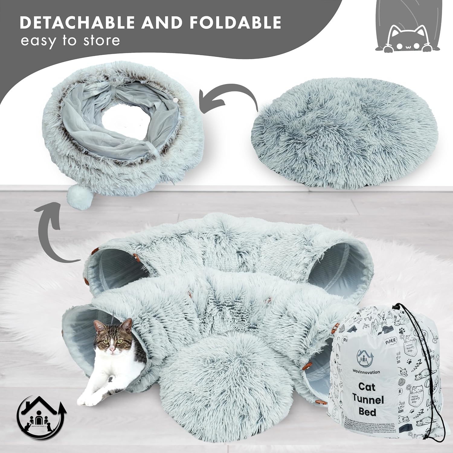 • ๐—–๐—ผ๐—น๐—น๐—ฎ๐—ฝ๐˜€๐—ถ๐—ฏ๐—น๐—ฒ ๐—ฎ๐—ป๐—ฑ ๐—–๐—ผ๐˜‡๐˜†: Warm and fluffy design that can be turned to donut, moon shaped or a long tunnel with fluffy balls. Washable and easy to clean.