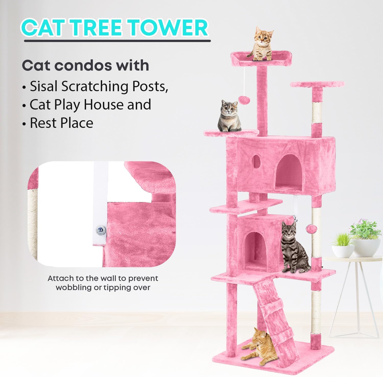 FDW Cat Tree 70in Cat Tower Multi-Level Durable Cat Scratching Post & Cozy Fun Cat Jumping Platform Space Saving Cat Condo Pet Play House for Indoor Cats,Pink