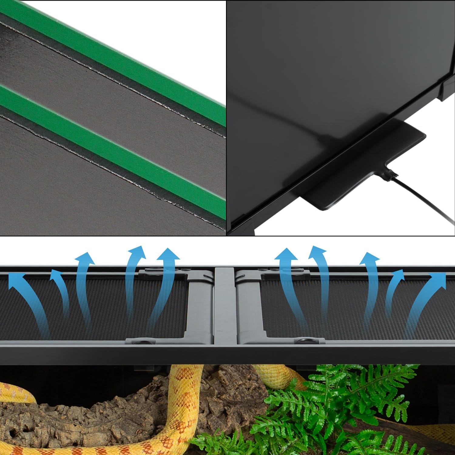 • 【Double Openable Top Cover】This black glass reptile tank has two openable mesh cover on the top, it's easy to feed your pet or clean the tank. Cable hole on the top for organizing messy wires easily.