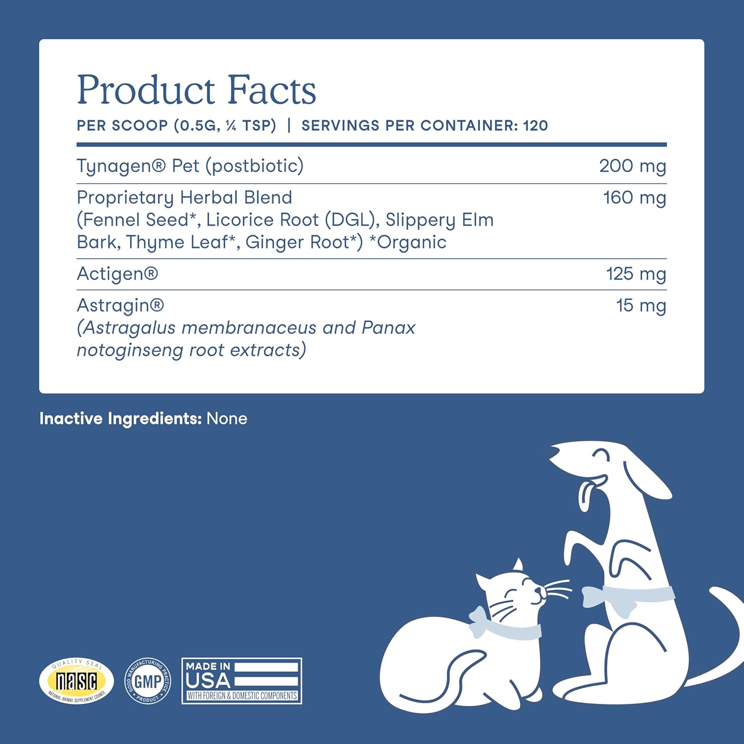 • No fillers: Promotes integrity of the gut lining and supports cat and dog gut health and immune system; formulated with Actigen prebiotics, Tynagen postbiotics, plus ginger root, fennel seed and licorice root extracts; digestive comfort and quality of life for your pet