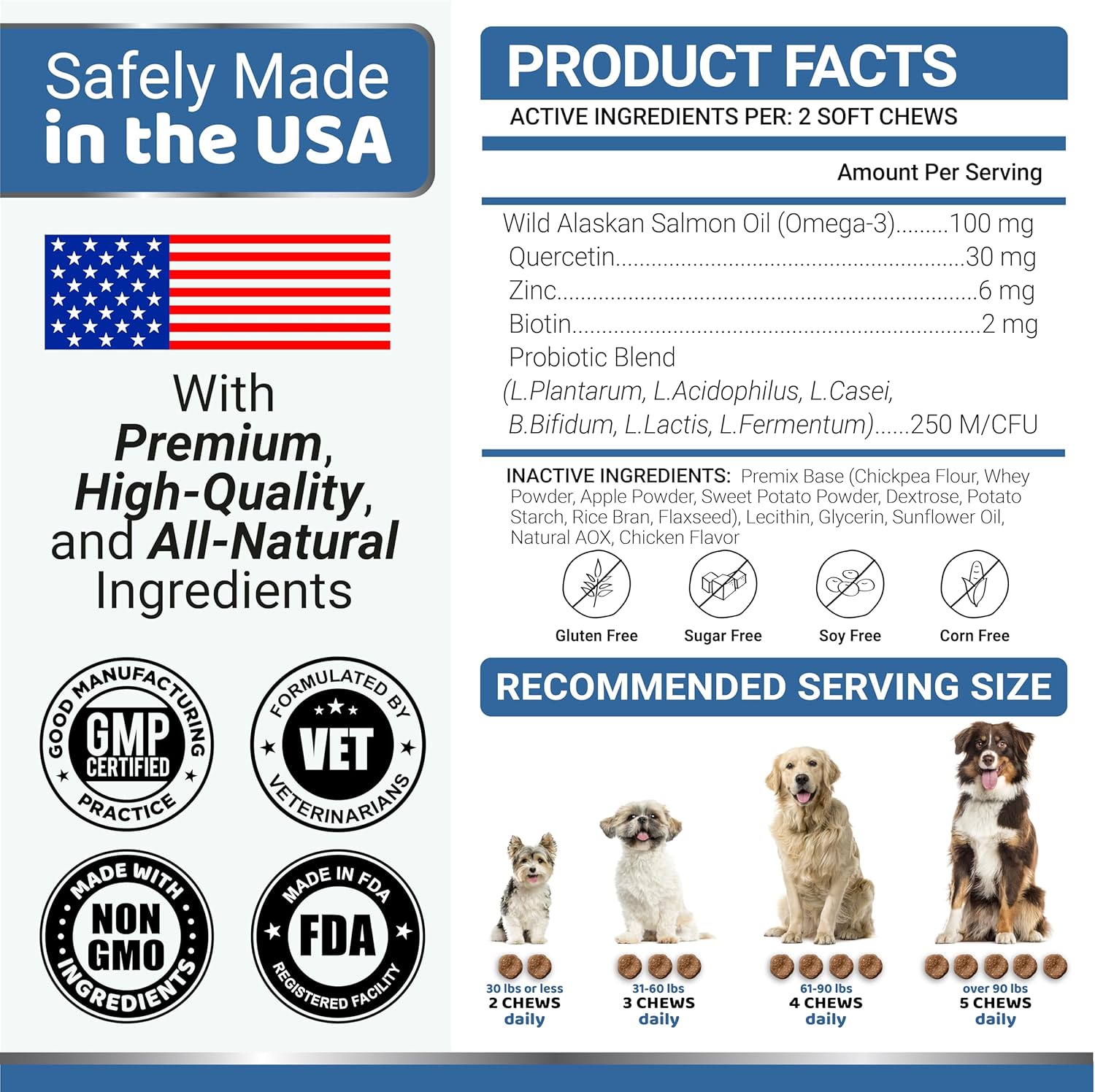 • Premium Omega-Rich Formulation: Loaded with essential fatty acids, DHA, and EPA, our Omega 3 chews for dogs are expertly crafted in the USA to ensure your pet's coat and skin are in prime condition. Skin and coat supplement for dogs