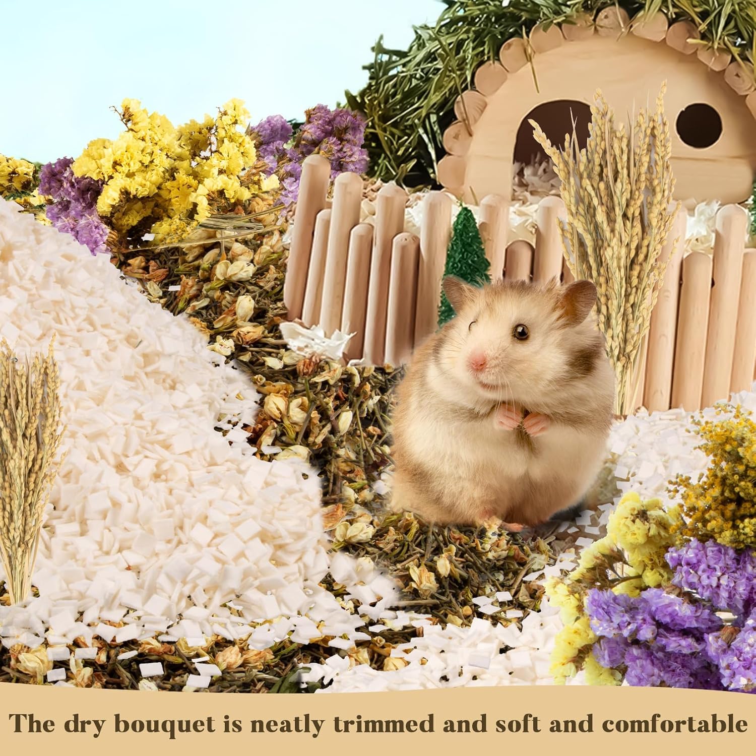 • A Gift from Nature:Yellow and light purple and yellow myosotis; rice; rabbit tails; wheat; solidago canadensis and its stems, a variety of flowers and dried rice flowers are mixed. It creates a warm place for the hamster to live