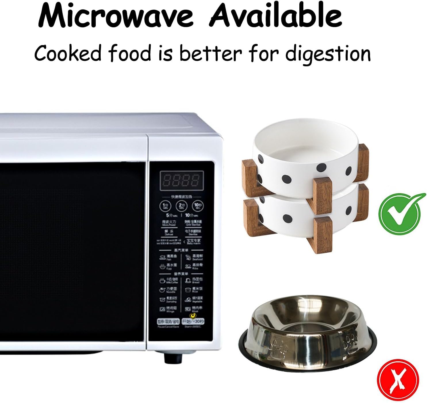 • EASY TO CLEAN CERAMIC - This easy clean dog bowl set is dishwasher proof, as well as easy to handwash and wipe down. With thick walls, these ceramic bowls for pets are sturdy, leak-free and weighty yet not too heavy. Double Bowl Design:One dog bowl for food and one for water, Each ceramic cat bowl has a Unique wooden stand, raising the dishes closer to your pet for more comfortable eating