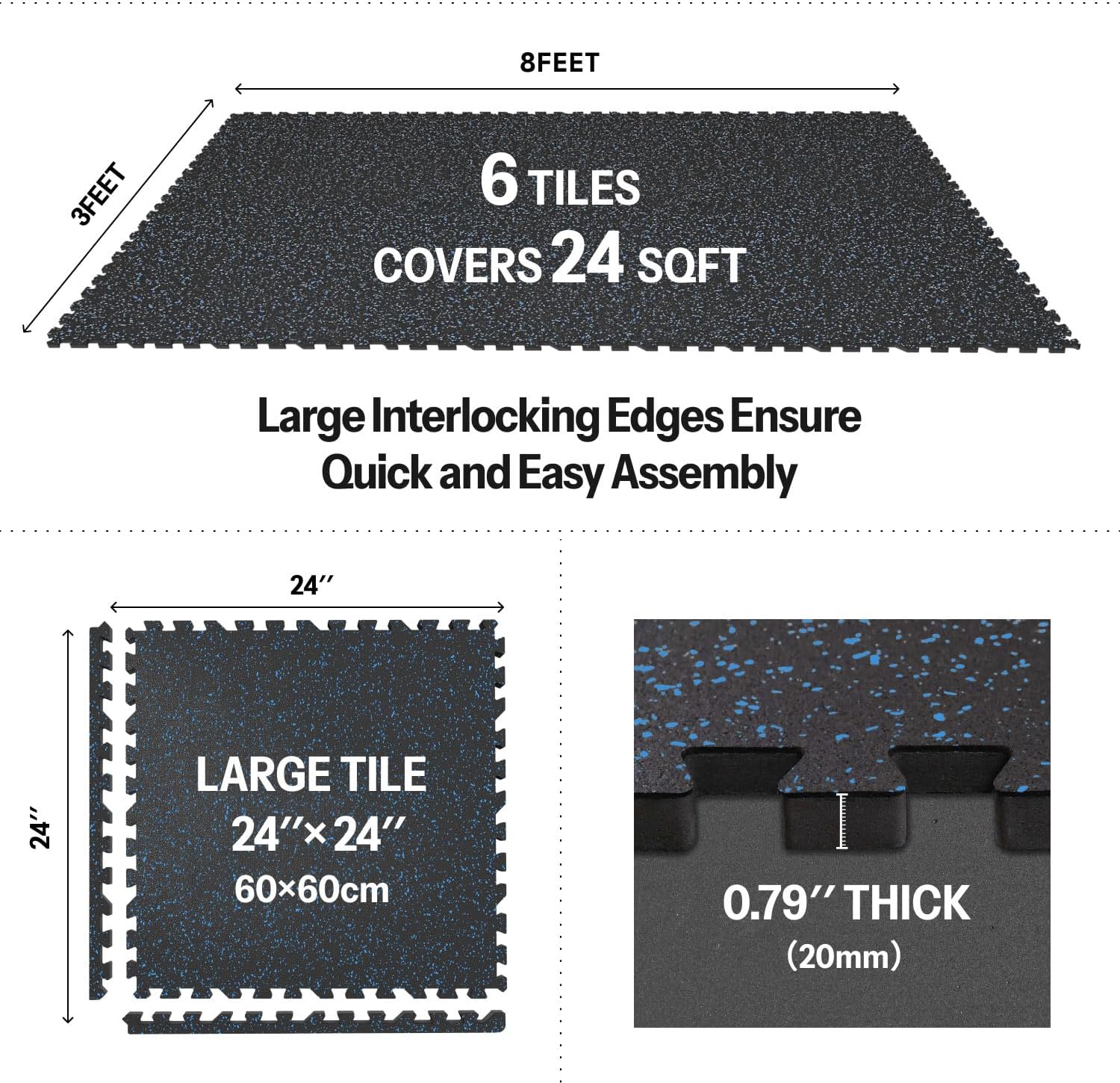 • [Easy to Assemble and Detach]: 6 tiles (24" x 24" x 0.79" each), covers 24 sq ft (6 × 4 ft). Upgraded larger interlocking locks provide a secure fit, preventing any separation during use, ensuring you can work out without concerns of shifting. Simple assembly and detachment make it effortless to set up your home gym.