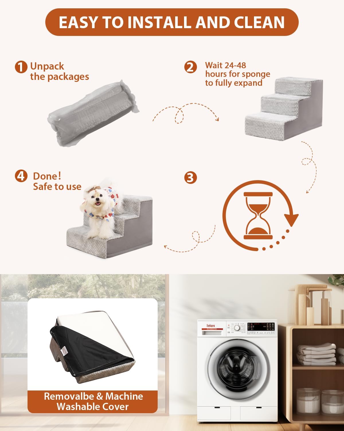 • 【INSTALL AND CLEAN】Our pet stairs are vacuum-packed and require installation.Please follow instruction manual or video. Let foam fully expand for 24-48 hours before use.The outer cover has a smooth zip for easy removal of foam core and fiberboard. Do not machine wash or dry the foam core.