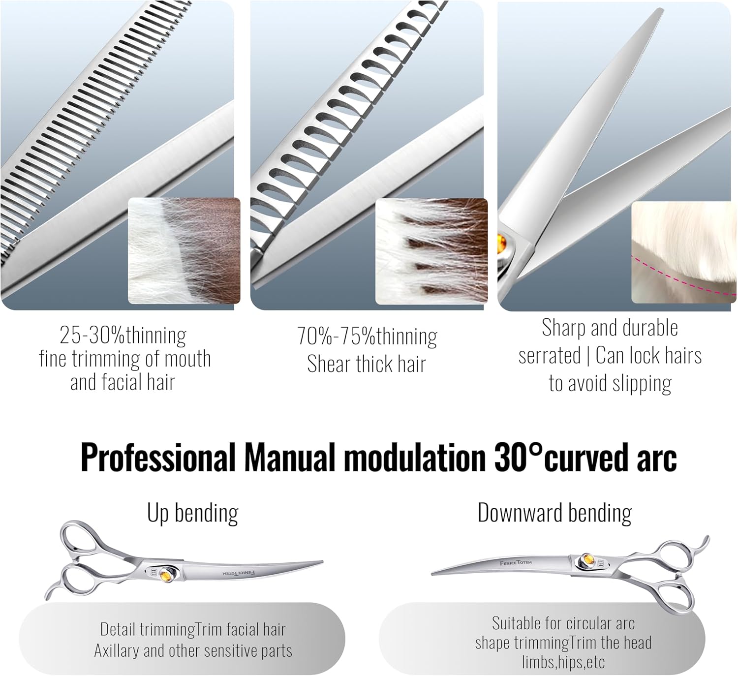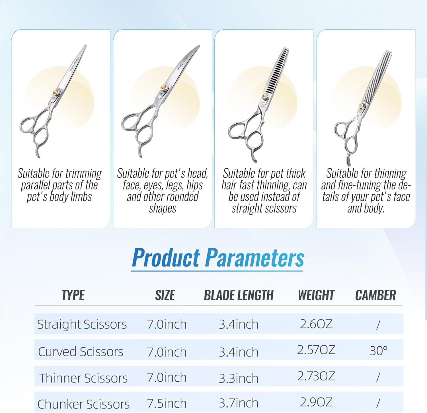 • Features: These pet scissors set with ergonomic handles that fit most people. Fine polished brushed surface with delicate metal texture. Precise adjustable screws effectively prevent the screws from loosening due to prolonged use.