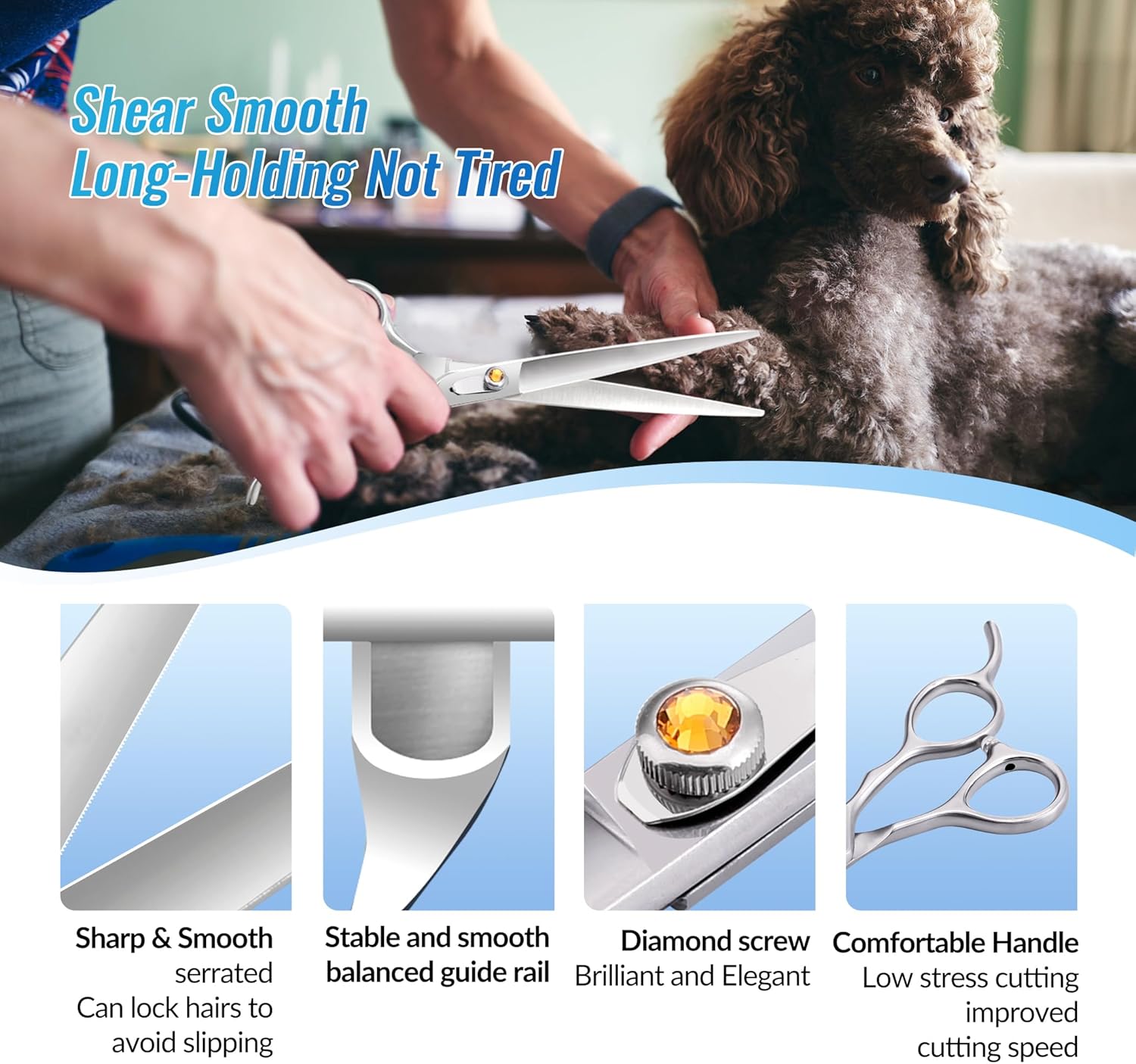• Features: These pet straight scissors are 7 inches long with ergonomic handles that fit most people. Fine polished brushed surface with delicate metal texture. Precise adjustable screws effectively prevent the screws from loosening due to prolonged use.