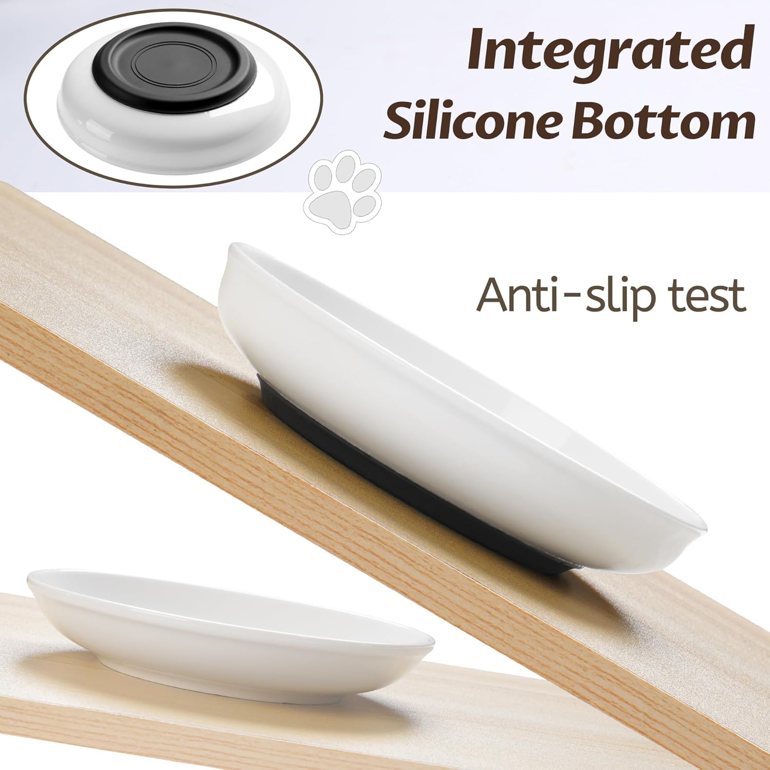 • 【No Slide, No Clank Noise】: To prevent slidding, we designed a integrated silicone base, ensures that the food bowl will not tip over or move easily during feeding time. Besides, the silicone base can protect your floors, and reduces the noise from clanking.