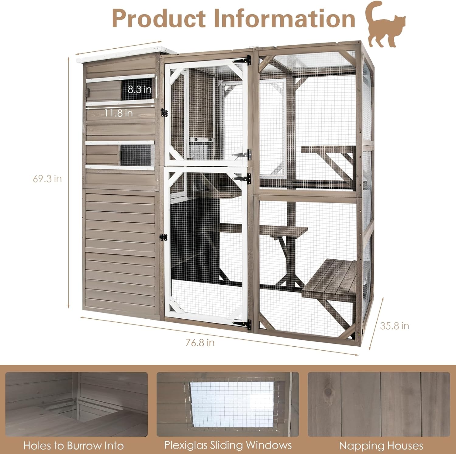 • 【Large Cat House】The outdoor cat enclosures is spacious enough and high enough at a height of 69.3" with 4 safety latchs for adults to get in and out or interact with it, as well as easy to clean.