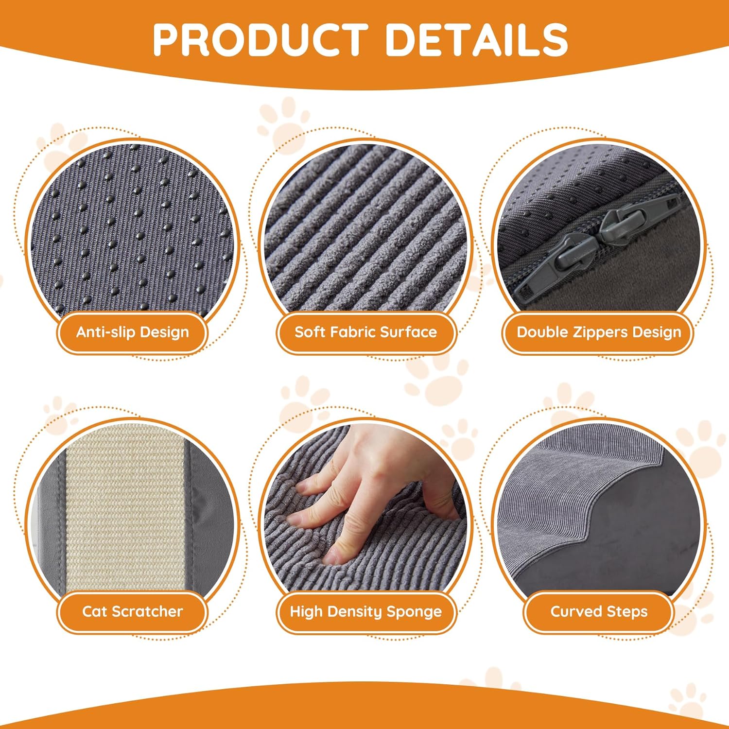 • 【Safe and Steady Design】Curved steps provides maximum climbing comfort for puppies and kittens. Surface layer of the dog ladder is made of thick coral fleece, providing a soft and non-slip experience for your pet's feet. High-density of pure foam make the stair more steady when your pets walk on.