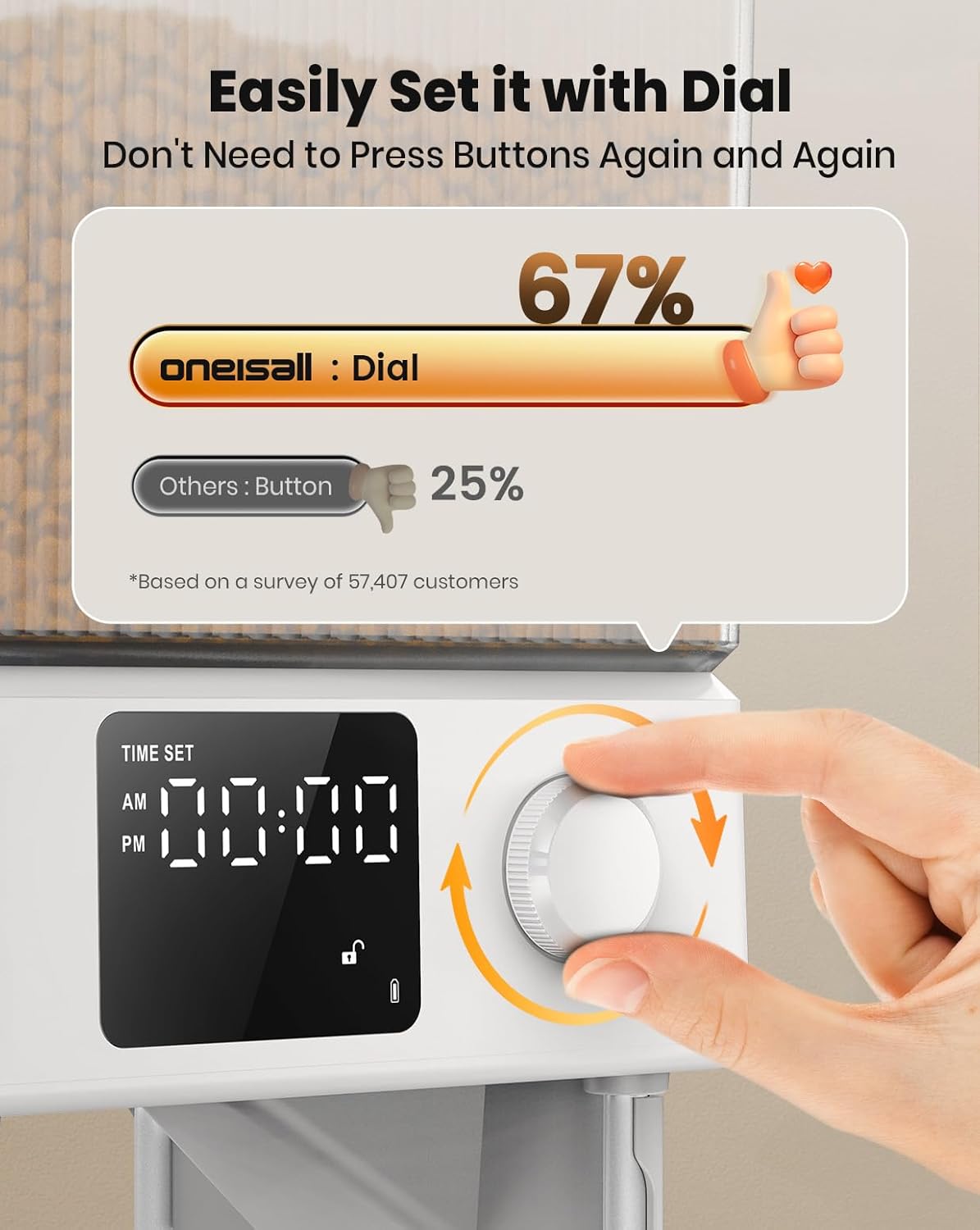 • Easy to Set Up: oneisall automatic cat food dispenser has a dial to simplify the programme. Everyone can easily set up it and control feeding