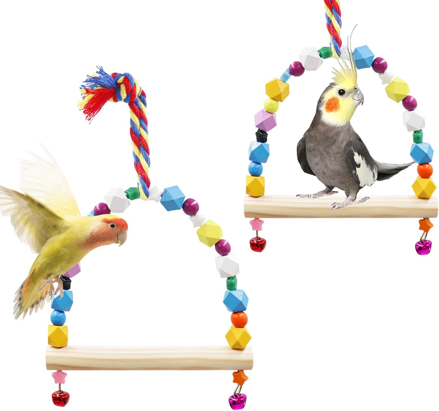 2 Pack Bird Swing, Hanging Colorful Wooden Parrot Perch Stand Toy, Bird Cage Accessories, Suitable for Small to Medium Birds Parrots Parakeets Cockatiels Conure Budgies Love Birds