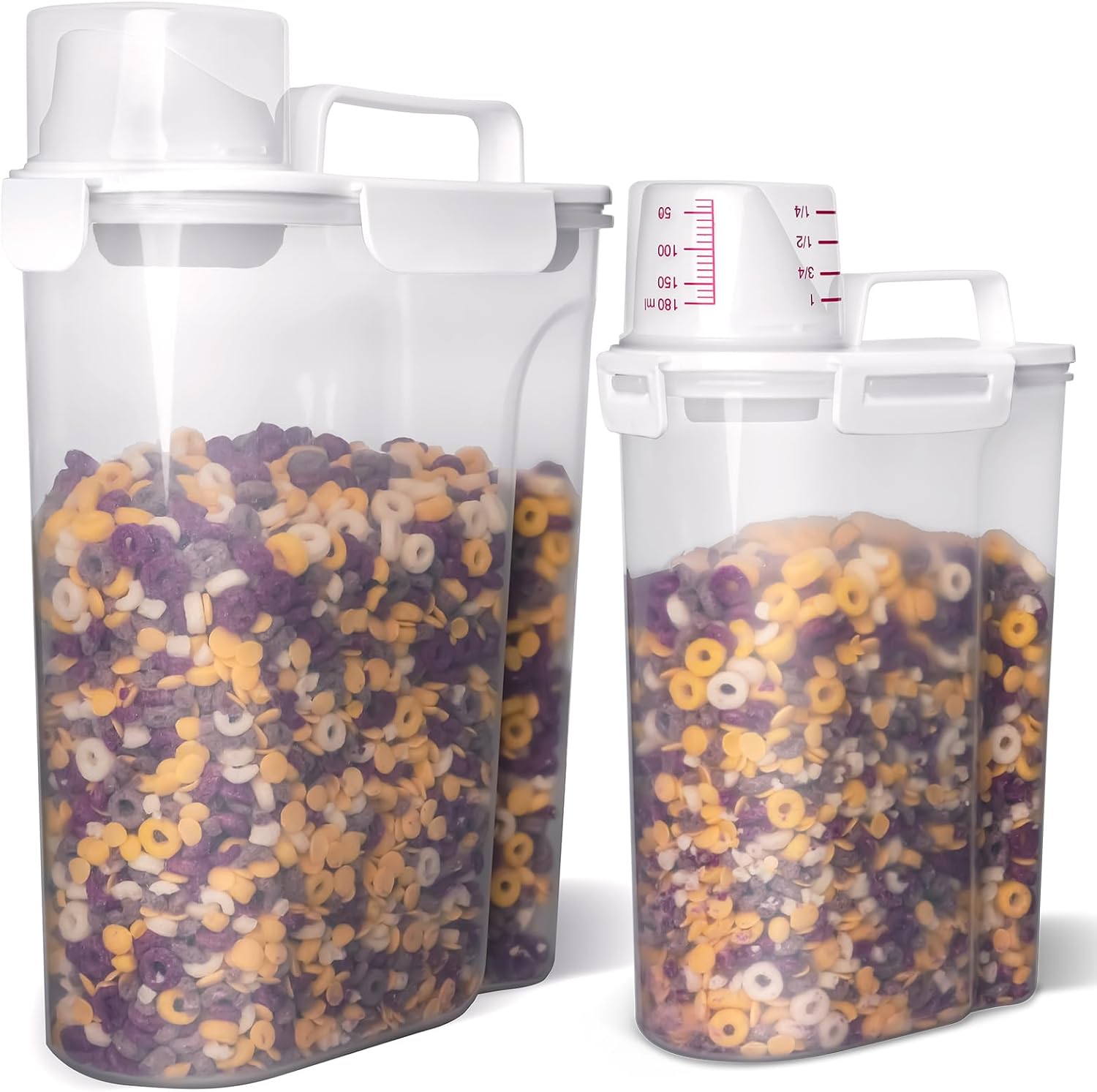 • CLEAR and AIRTIGHT CONTAINERS: it's a really clear plastic container. You can identify the contents without opening them. 4-sided locking lid with silicone seal.It seals really well so you don't need to worry that your cereal goes stales. Measuring cup can screw on over the pour spout. It also can keep out of mice, rats, insects and other pests away