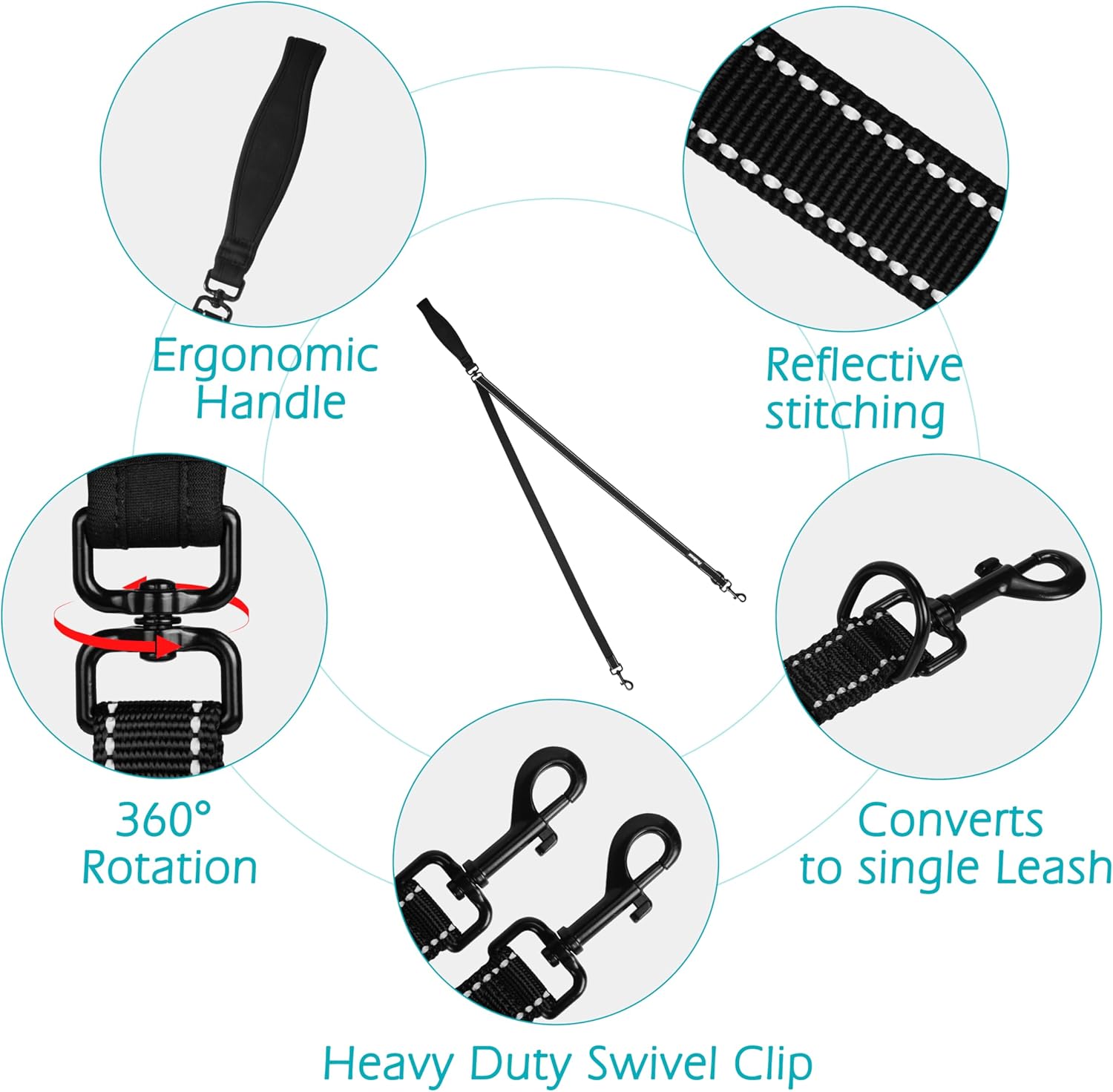 PetBonus Two Point Control Dog Leash, Works with No Pull Harnesses, No Tangle Training Leashes, Soft Padded and Reflective Walking Lead, Converts to Single Lead for Medium Large Dogs (Black)