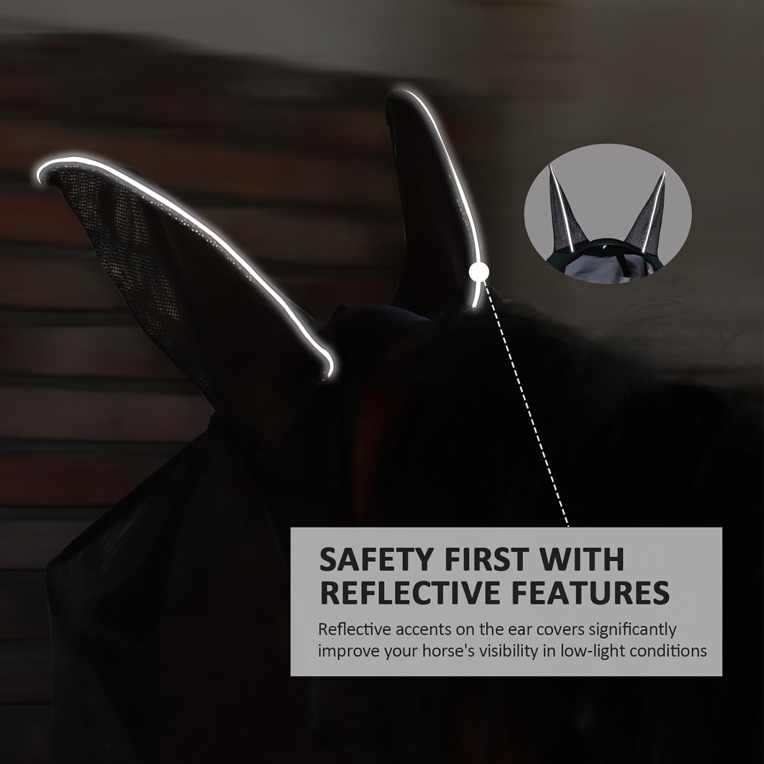 • Safety First with Reflective Features: Reflective accents on the ear covers significantly improve your horse's visibility in low-light conditions, providing an extra layer of safety during early morning or evening routines.