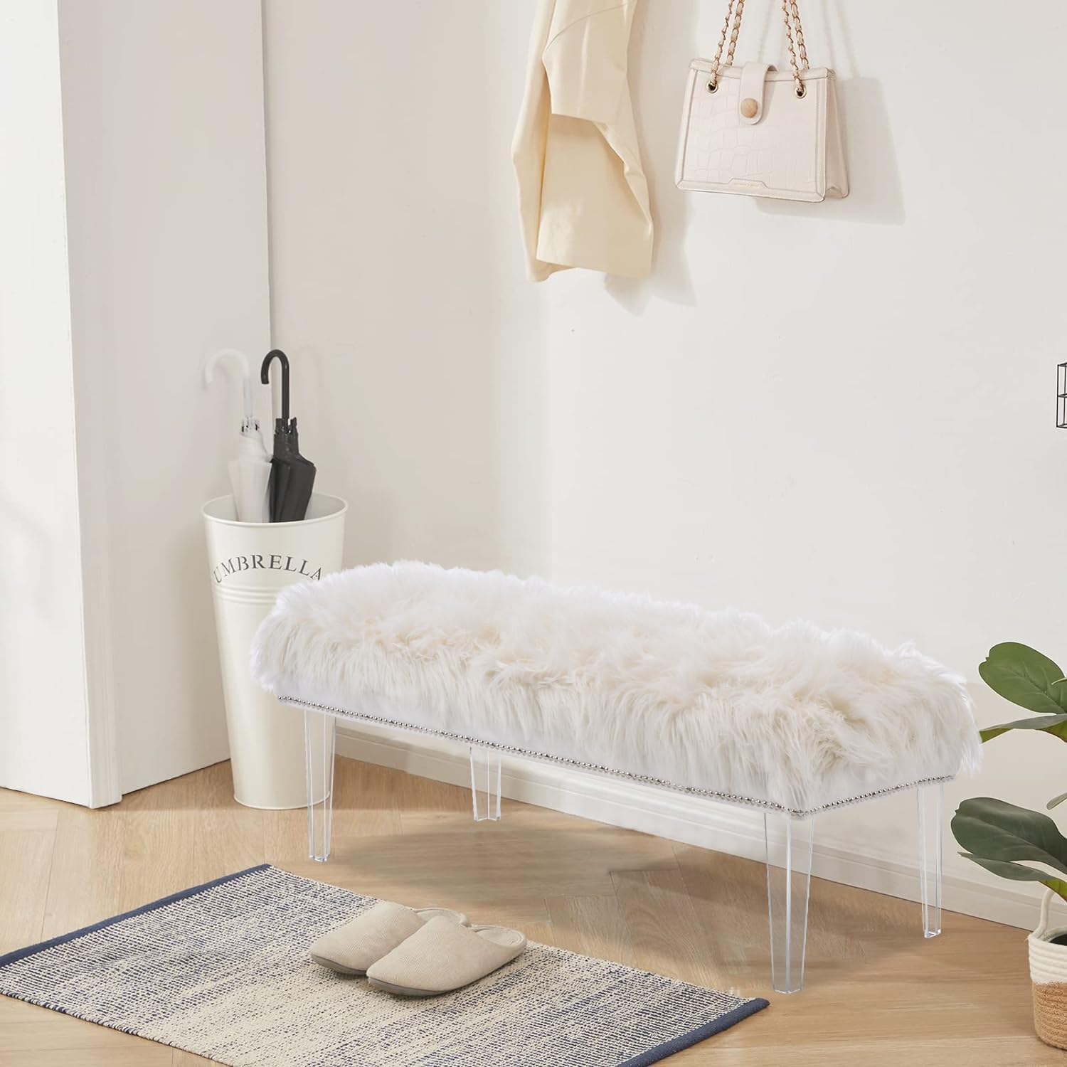 - Comfortable and Durable: Our ottoman bench combine soft white faux fur with solid bench legs. Thick cushioning creates a plush place to sit or to rest your feet, while the sturdy base offers added stability. The fluffy fur makes the chair look delicate, comfortable. And it's pretty easy to install, simply fitting the four stool legs onto it with a screwdriver. There are 4 different materials of the bench legs for you to choose you can choose your favorite one according to your needs
