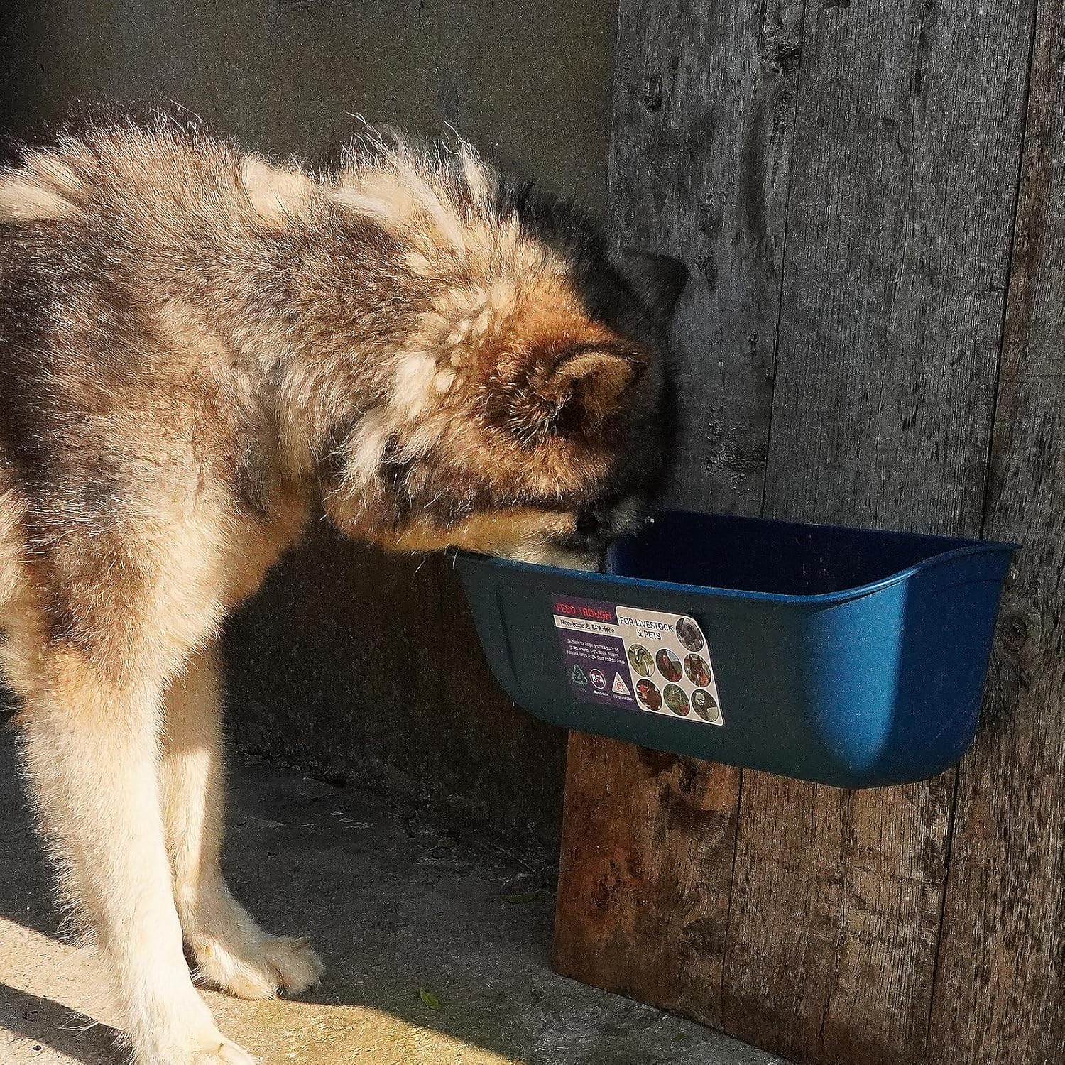 Goovilla Large Feed Trough, Hanging or Screw-in Fence Feeder with Clips, 2 Pack 9 Quart Goat Feeder Supplies, Dog Horse Hog Pig Livestock Poultry Plastic Feeder Trough Bucket for Large Animal, Blue