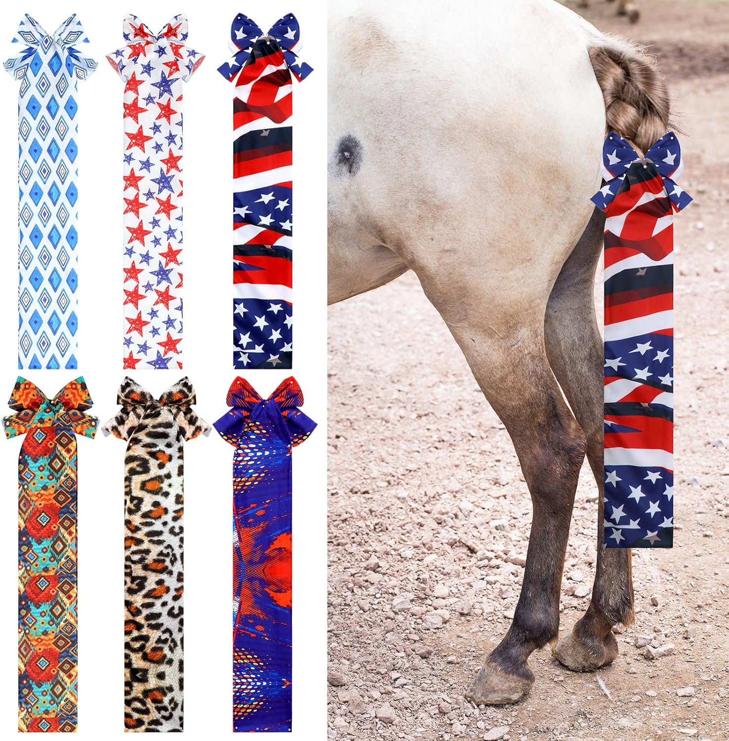 • Vibrant and Colorful Designs: our tail wraps for horses come in an array of colorful designs, giving horses a stylish appearance; Each of the 6 bags boasts a distinct design, diamonds, leopard print, stars, American flag, reflecting a vibrant and energetic vibe; The pictures genuinely express the bags' colors, adding a splash of color to any horse's tail