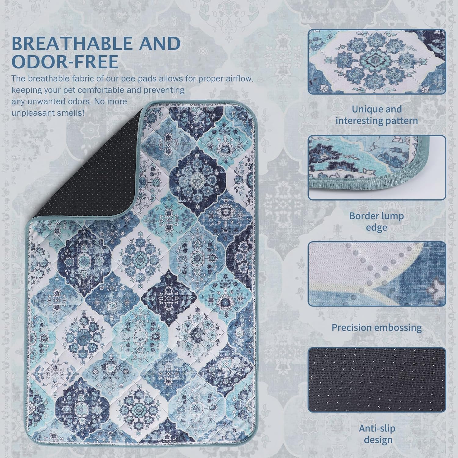 • 【Fashionable and Non-Slip】Our bohemian-print design adds a natural touch to the potty pads for dogs, giving your room a warm, casual vibe. And the non-slip bottom design makes the pet pee pads can achieve a certain fixed effect, you can put it anywhere you want. Soft and non-slip material makes it safer for dogs to use the pads.