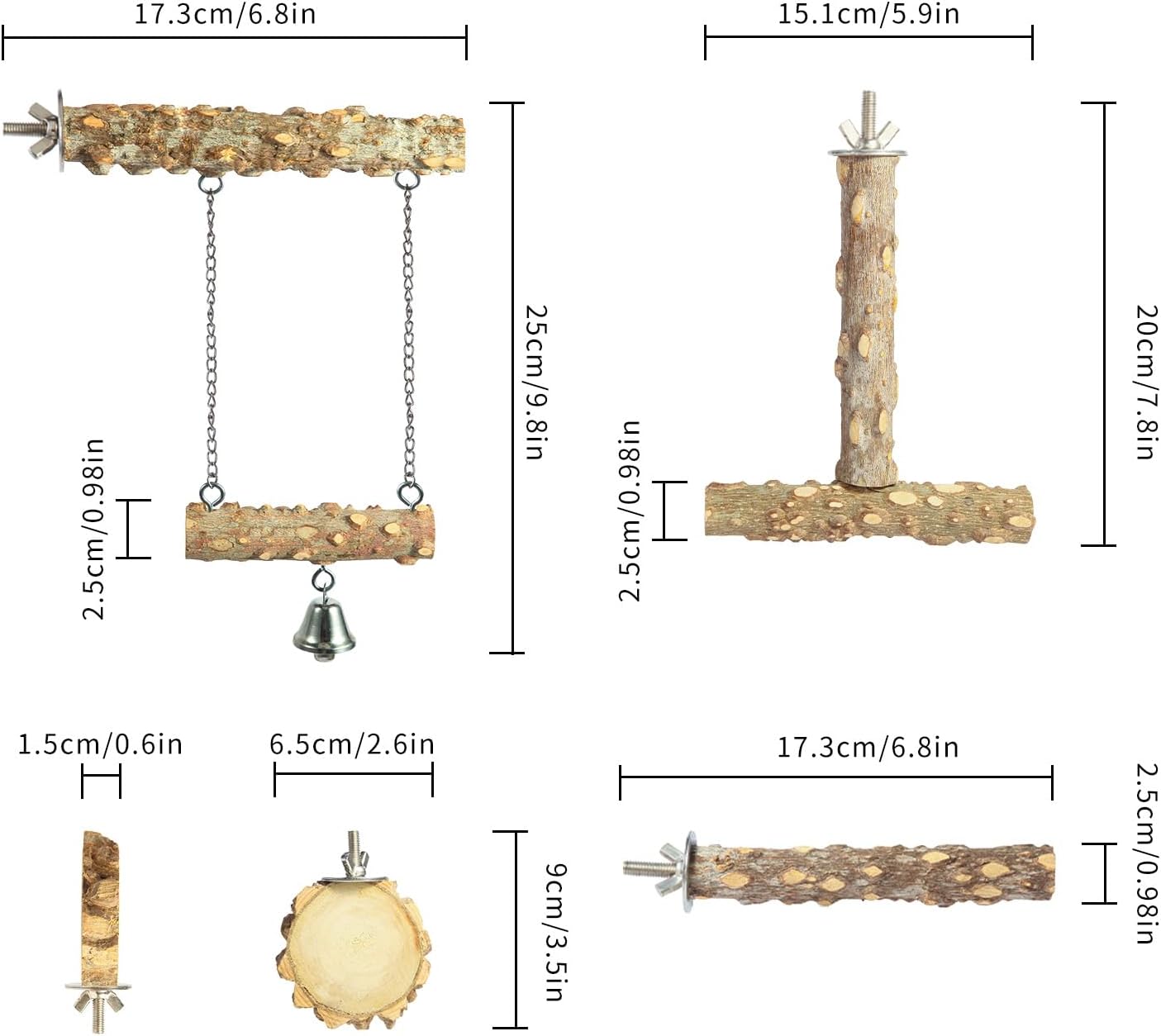 • Complete Set for Bird Enjoyment: Includes 1 Wooden Perch, 1 O-Shaped Platform, 1 Bird Swing, and 1 T-Shaped Perch. Offers a variety of perch types to simulate a natural habitat for your birds, promoting natural behaviors.