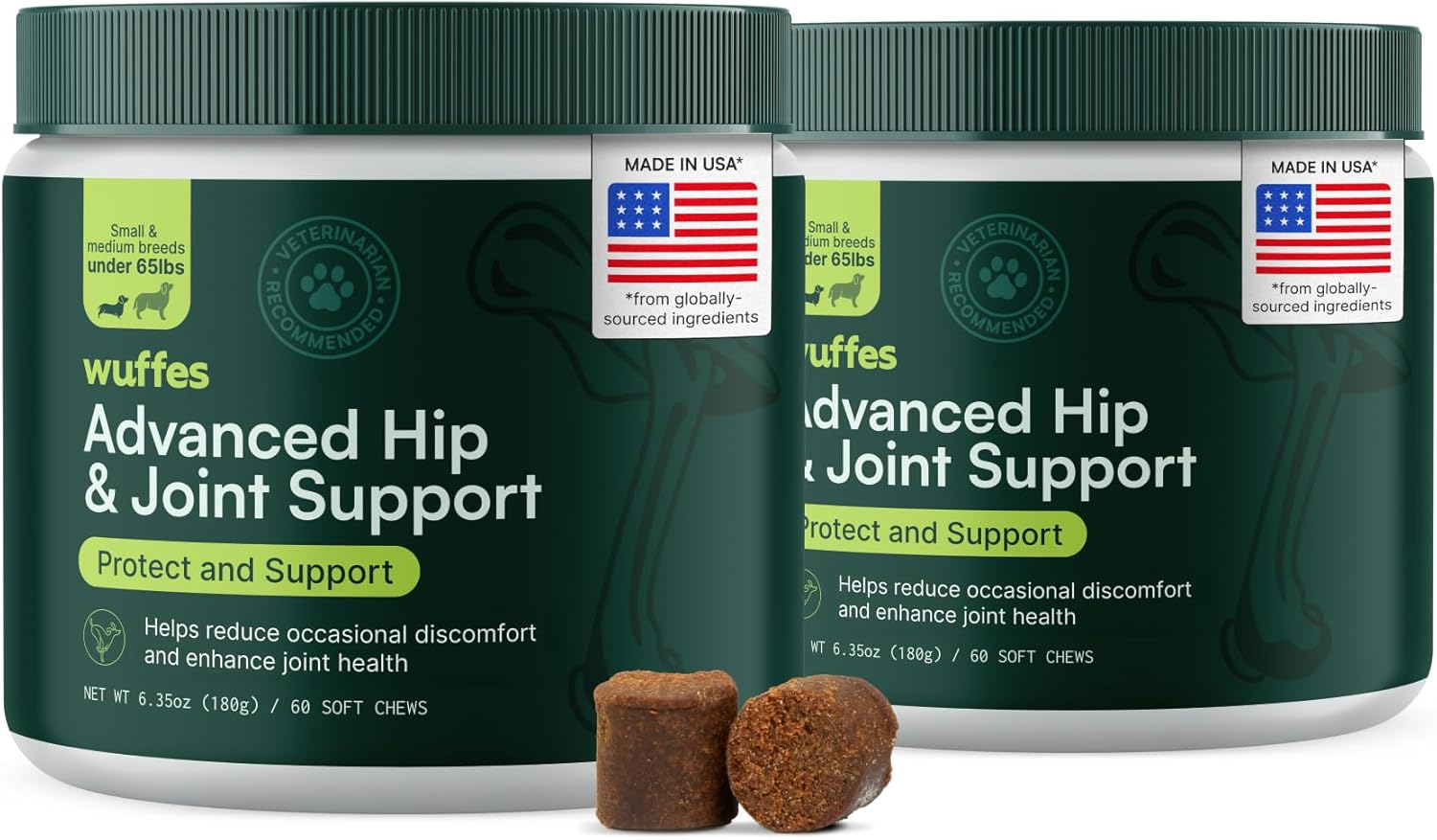 Wuffes Advanced Dog Hip and Joint Supplement with Glucosamine, Chondroitin, Omega 3, MSM, and Green Lipped Mussel, 120 Pork Flavored Chews for Small Dog Breeds