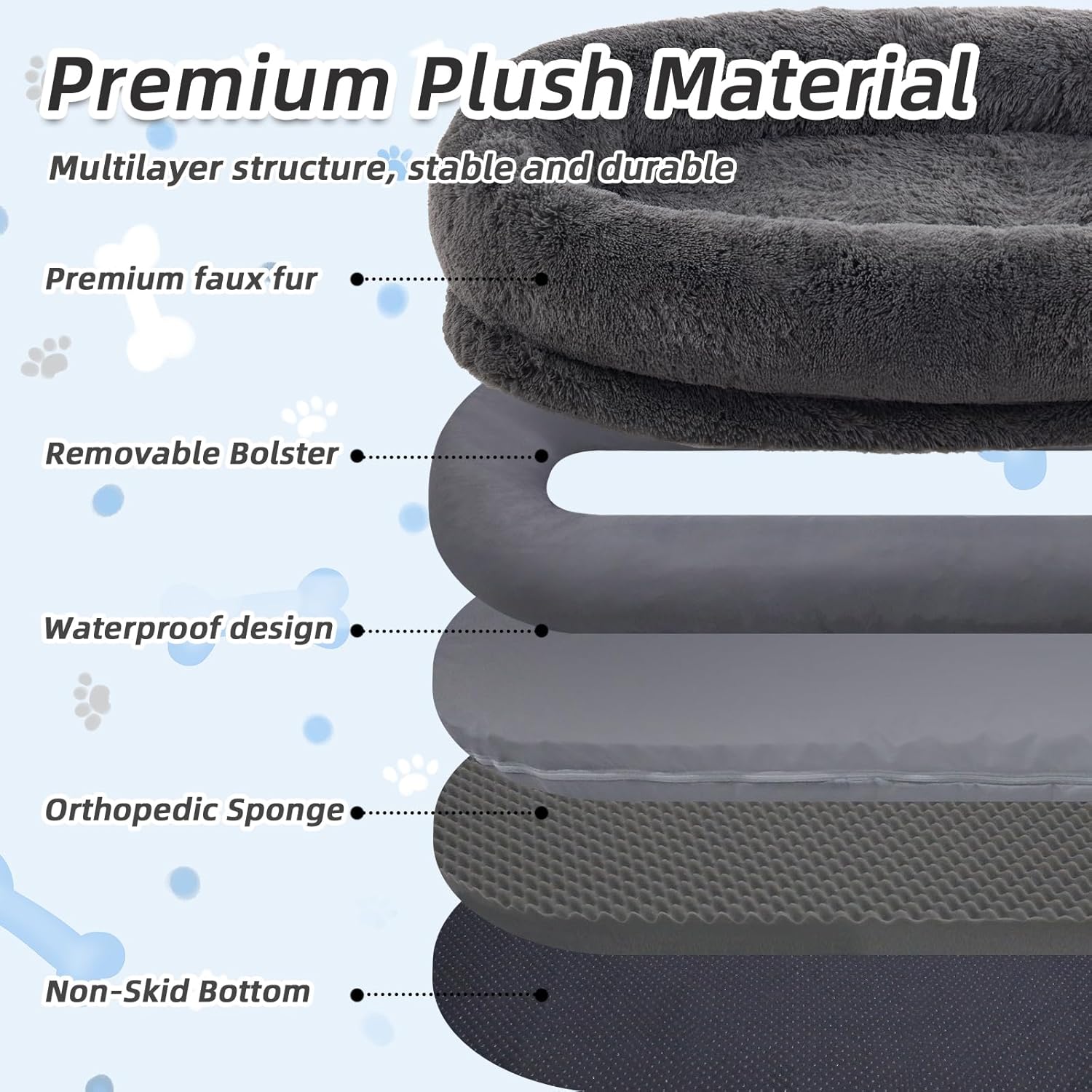 • Moms Embracing-like sense of security: 71*45*12 IN Dog beds for Large dogs provide oversized surround, The thick bolster allows you to tuck your hands and feet into it, just like lying in the arms of mom, warm, peace of mind. Effectively relieve your anxiety.