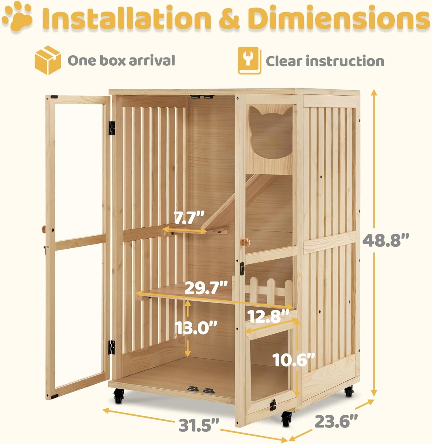 • Secure and Mobile Construction: Equipped with lockable universal wheels, this cat villa prevents mischievous escapes while facilitating easy cleaning; The wheels allow for convenient movement and repositioning, ensuring stability wherever you place it