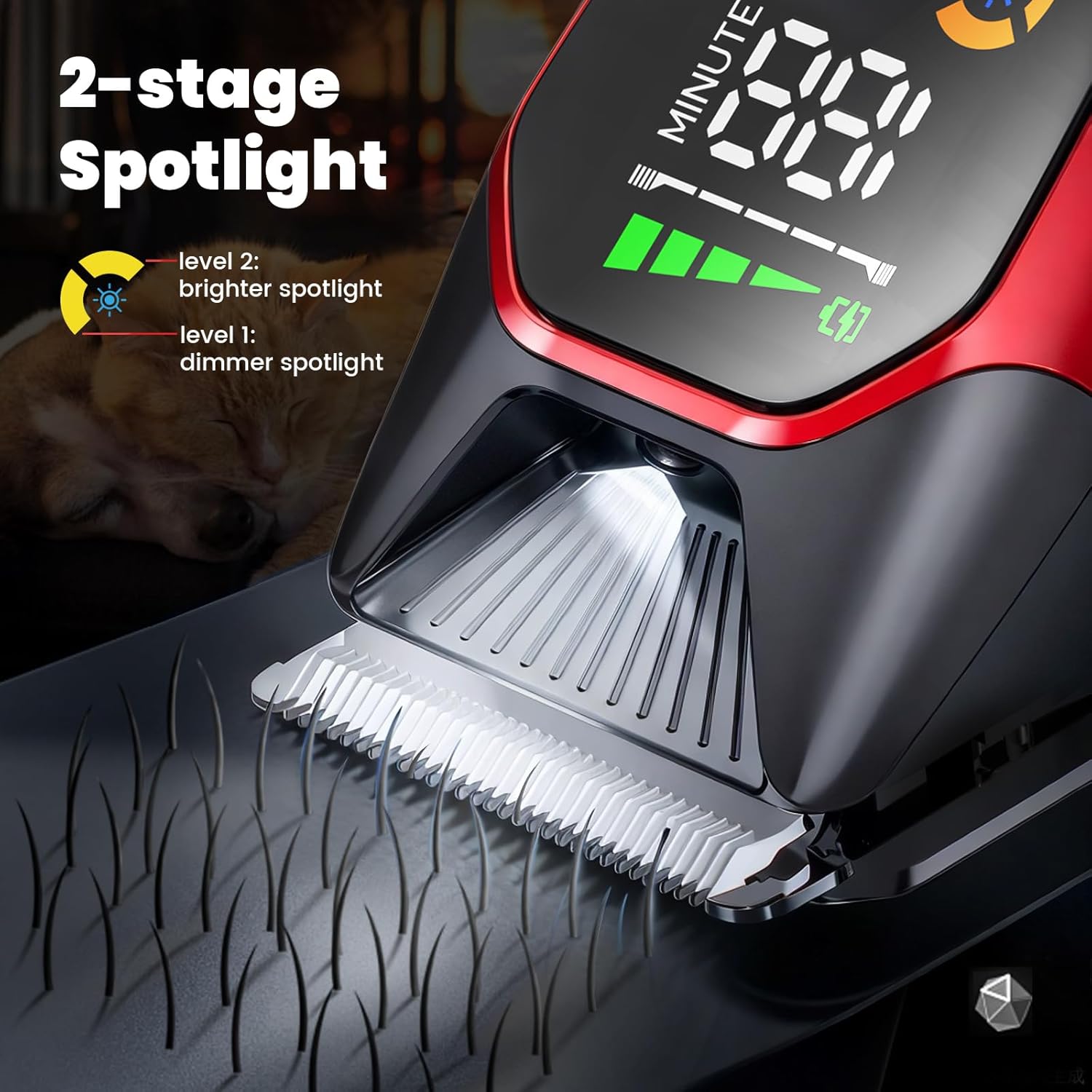 • DIGITAL DISPLAY&SAFETY LOCK DESIGN-The LCD panel shows the battery level,state of charge when charging,cutting speed,and blade life,long press 3 seconds for lock or unlock,easy to store and even travel with,ensuring that you can groom Animals wherever and whenever needed