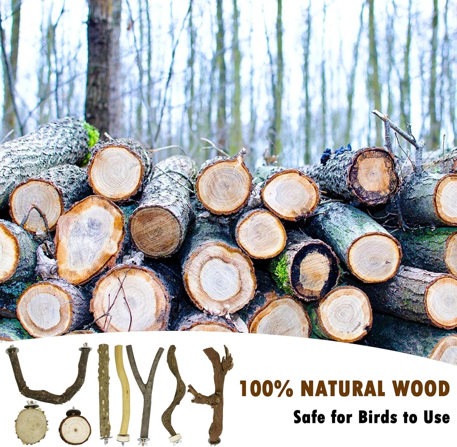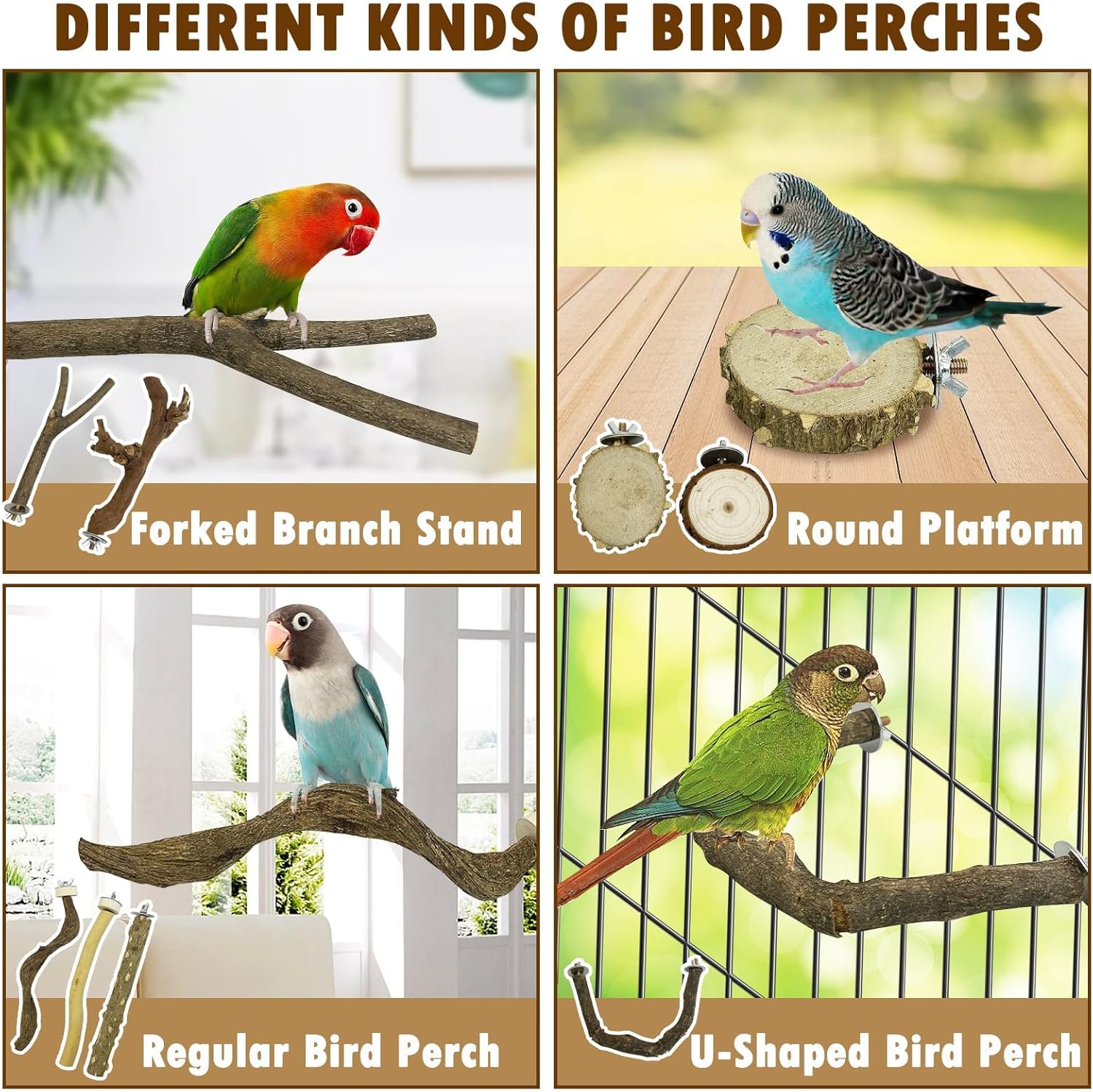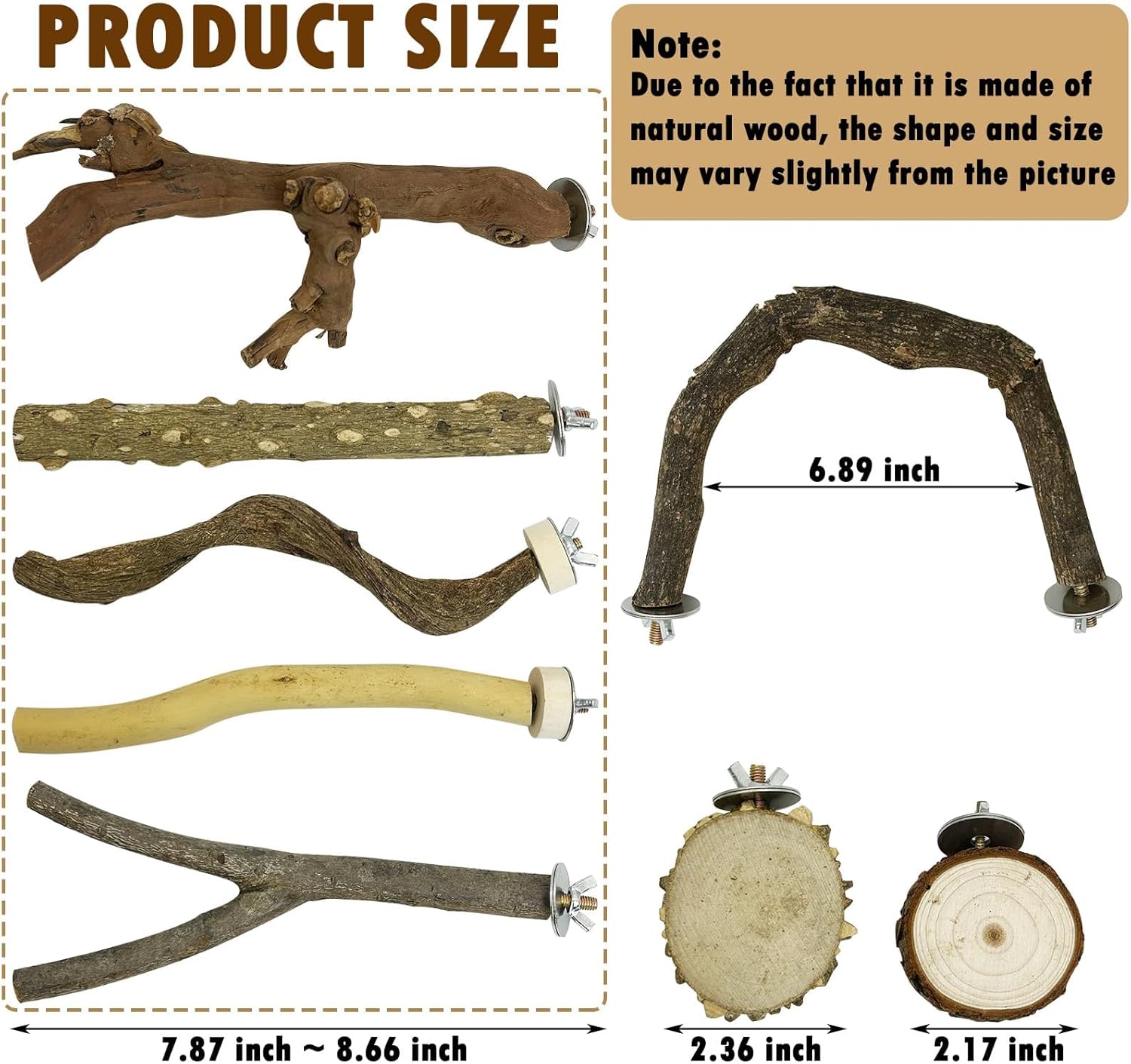 • Different Kinds of Bird Perches: Our natural bird wooden stand includes 8 different types of perches, 1 x forked branch bird perch,1 x U-Shaped bird perch, 2 x round platforms, and 4 x regular parrot perches.We provide the parts and various types of perches needed to assemble this bird perch stand to simulate a natural habitat for your birds and promote their natural behavior