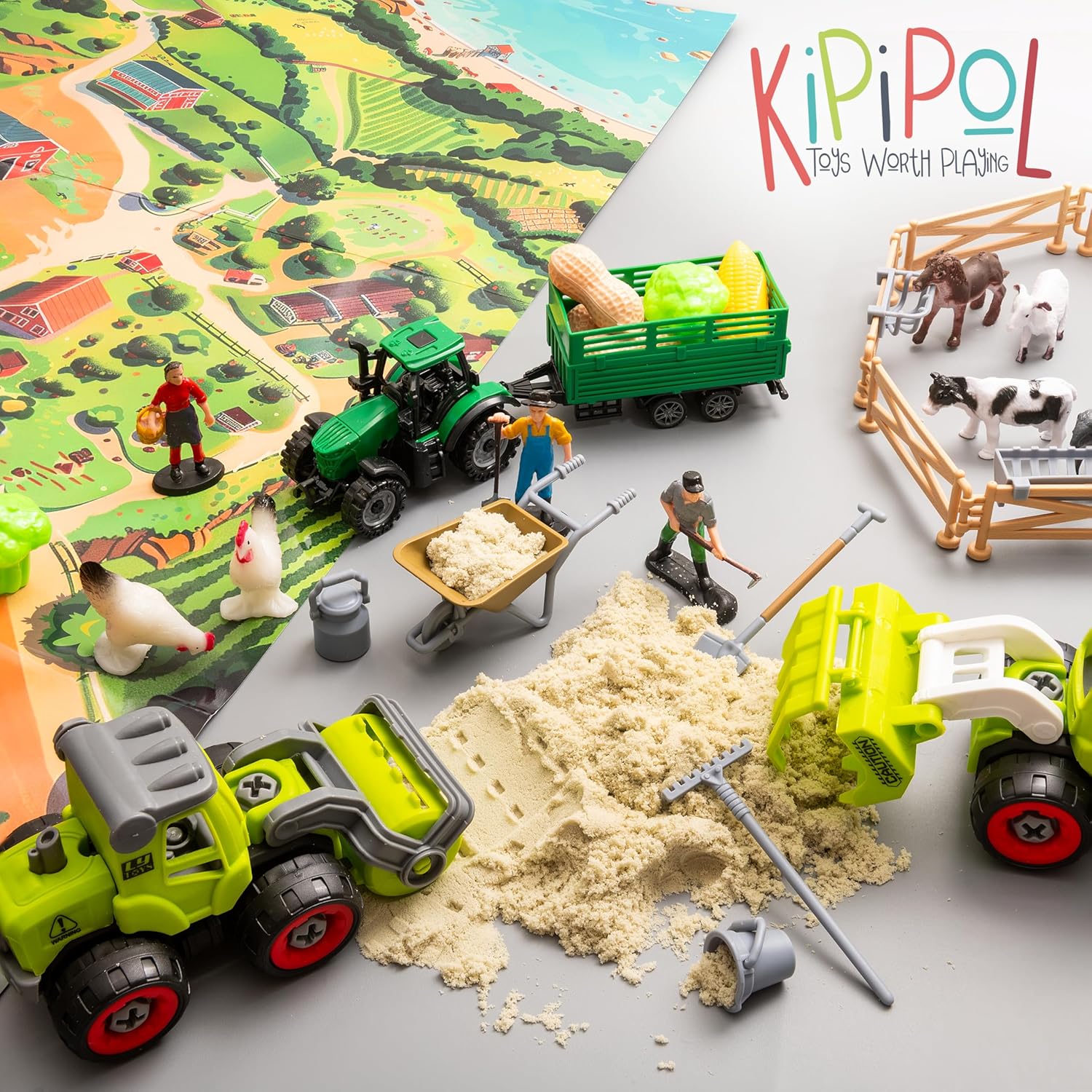• ALL- IN -ONE FARM SAND KIT: Unleash a world of sensory play with the KipiPol 59-piece farm sand box set! Packed with 2.2 lbs of moon sand, 3 detachable tractors, 3 farm workers, 15 farm animals, 9 veggies, 12 fences, 2 screwdrivers, 11 farm tools, an activity map, and a sandbox with a lid—everything your little farmer needs for endless toddler activities and sensory fun!
