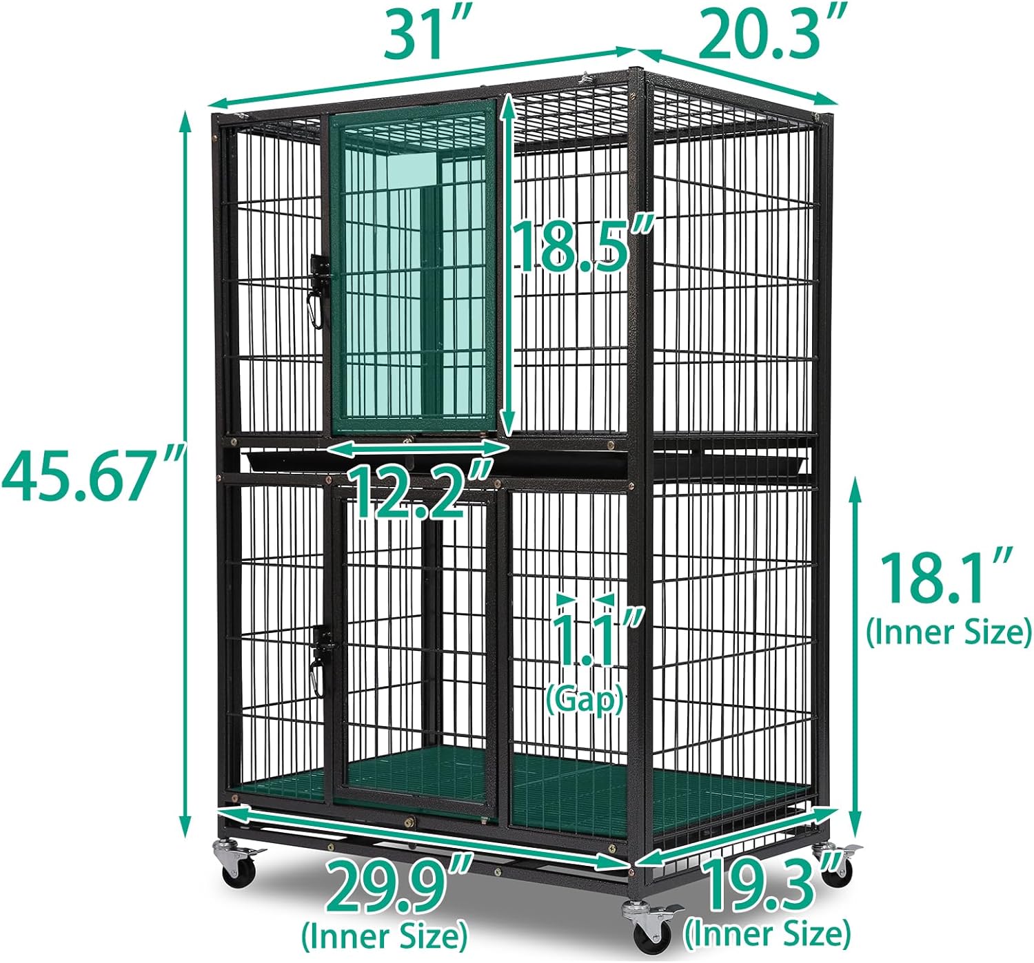• Suitable Breeds: This crate measures 31"L × 20"W × 46"H overall, with a single-tier interior space of 30"L × 19.3"W × 18"H. It is ideal for small to medium-small breeds dogs such Bulldog, Bichon Frise, Papillon, Chihuahua, Shih Tzu, and Jack Russell Terrier—and fits dogs within these breeds up to 26" in body length and 14" in height