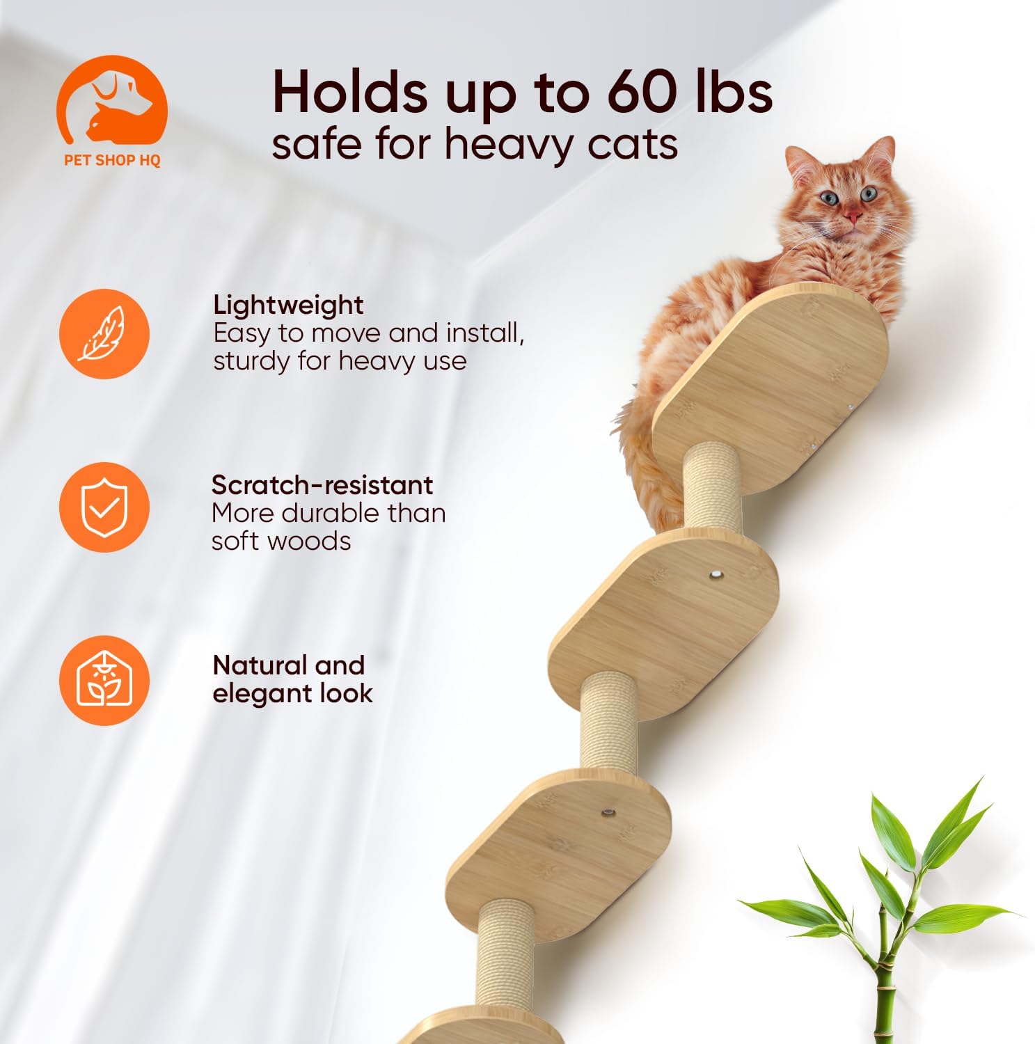 • 100% Bamboo Wood: Our cat shelves for wall are made from 100% bamboo, with no varnish or formaldehyde, ensuring a safe and eco-friendly option for your cat’s well-being. The wood is odorless, stylish, and durable enough to last long