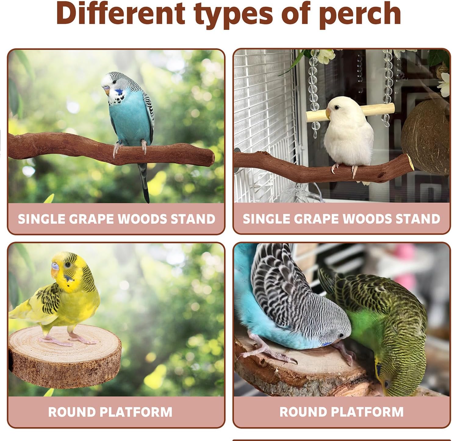 • [Different types of parrot perches]:- Create a natural habitat for your feathered friends with 3 grape stick perches, 2 parakeet perches.