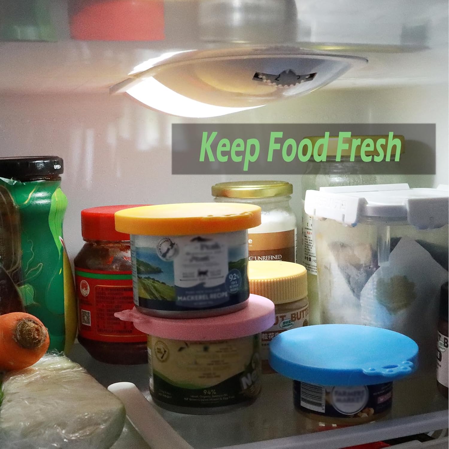 • UNIVERSAL SIZE: 4 x Cat Dog Food Can Lids Silicone covers (Pink/Green/Blue/Orange) & 1 x Pet spoon Can Opener (Pink). The lids have 3 different ring sizes with some stretch to fit most standard size pet cans. The can opener is also universal and can easily open a variety of cans.